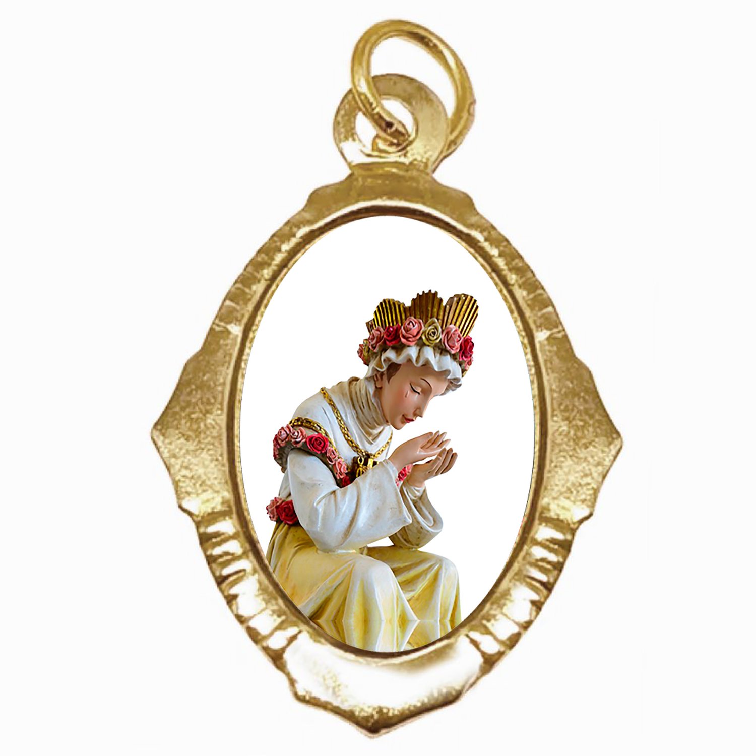 Cem unidades de medalha em chapa, com adesivo do santo de devoção em impressão digital e resinado em resina epoxi.