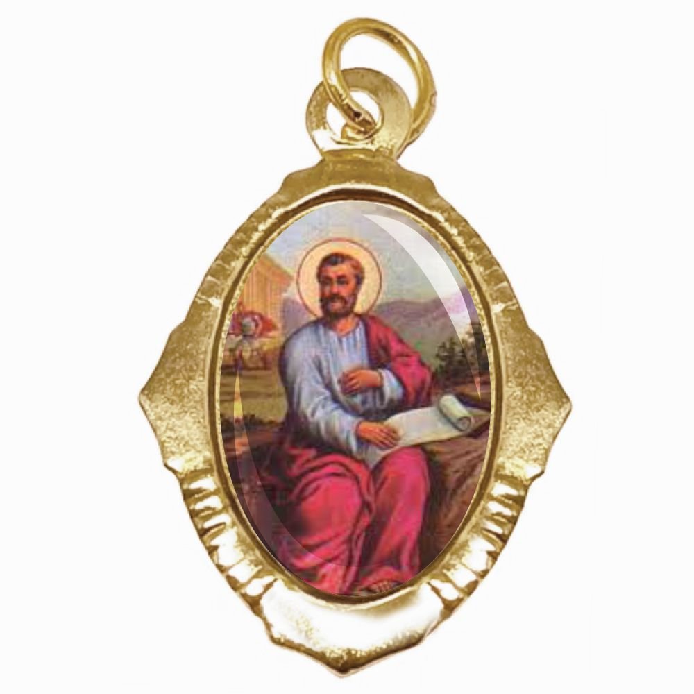 Cem unidades de medalha em chapa, com adesivo do santo de devoção em impressão digital e resinado em resina epoxi.