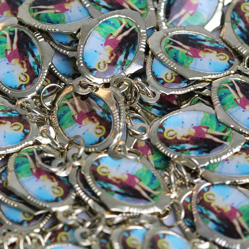 Cem unidades de medalha em chapa, com adesivo do santo de devoção em impressão digital e resinado em resina epoxi.