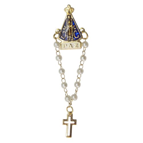 Boton Corpo de Nossa Senhora Aparecida com mini terço pérola e plaquinha com a palavra Paz.