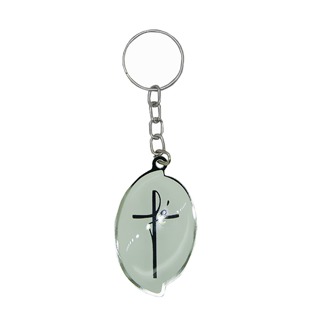 Chaveiro de chapa oval Fé branco. Chaveiro no formato Oval Aba com acabamento em chapa de metal niquelada e adesivo com impressão digital com resina epóxi cristal.