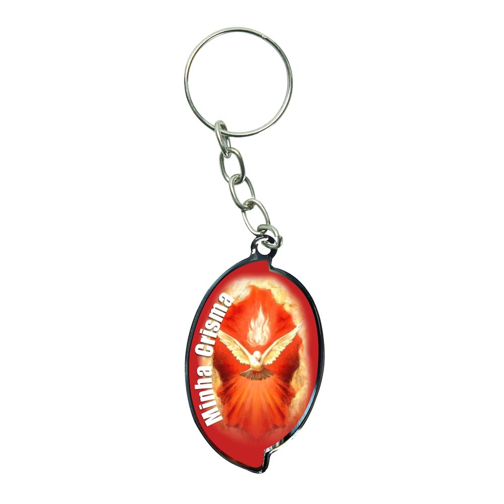 Chaveiro de chapa Aba Crisma. Chaveiro no formato Oval Aba com acabamento em chapa de metal niquelada e adesivo com impressão digital com resina epóxi cristal.