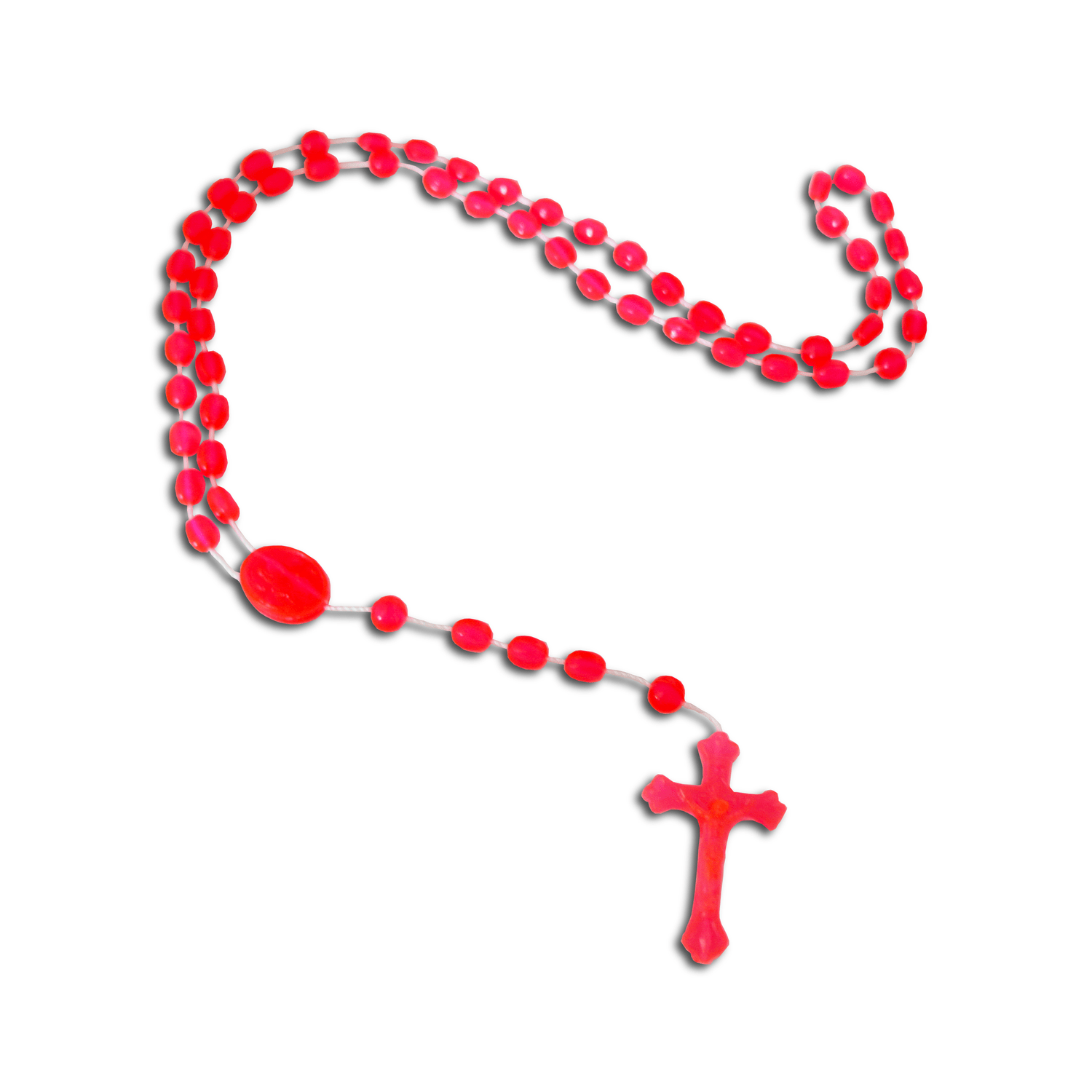 Terço de plástico Nylon laranja translúcido, contas 5mm entremeio do Sagrado Coração de Jesus e Nossa Senhora Aparecida. Medindo aproximadamente 35 cm de altura. Vendido a dúzia