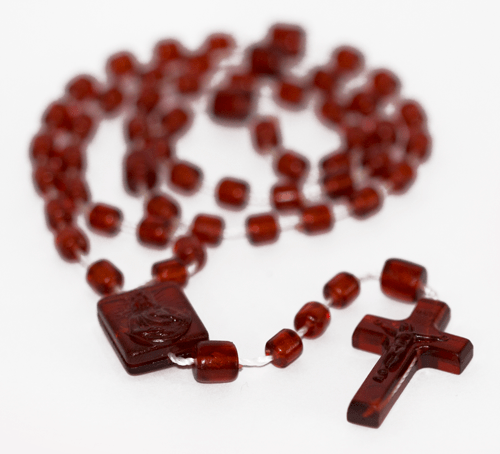 Terço de plástico Nylon cor marrom translúcido, entremeio do Sagrado Coração de Jesus e Nossa Senhora Aparecida. Medindo aproximadamente 35 cm de comprimento e contas com 5 mm de espessura. Vendido a dúzia