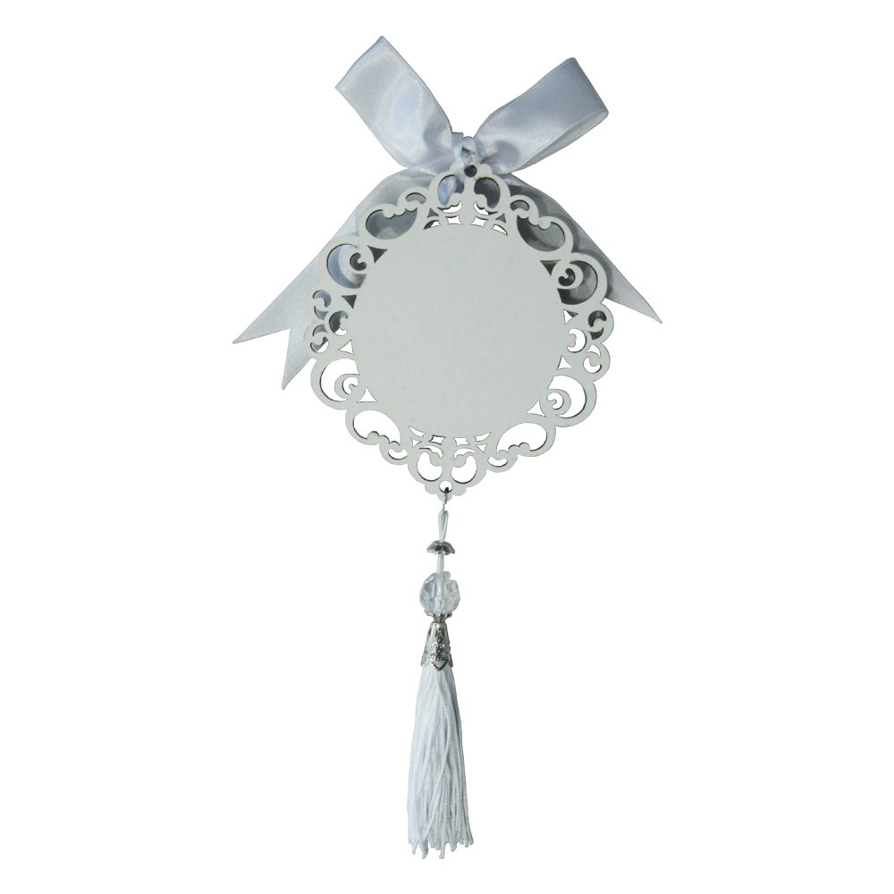 Adorno em MDF branco detalhes do corte em arabesco com laço e pompom, acabamento em resina.