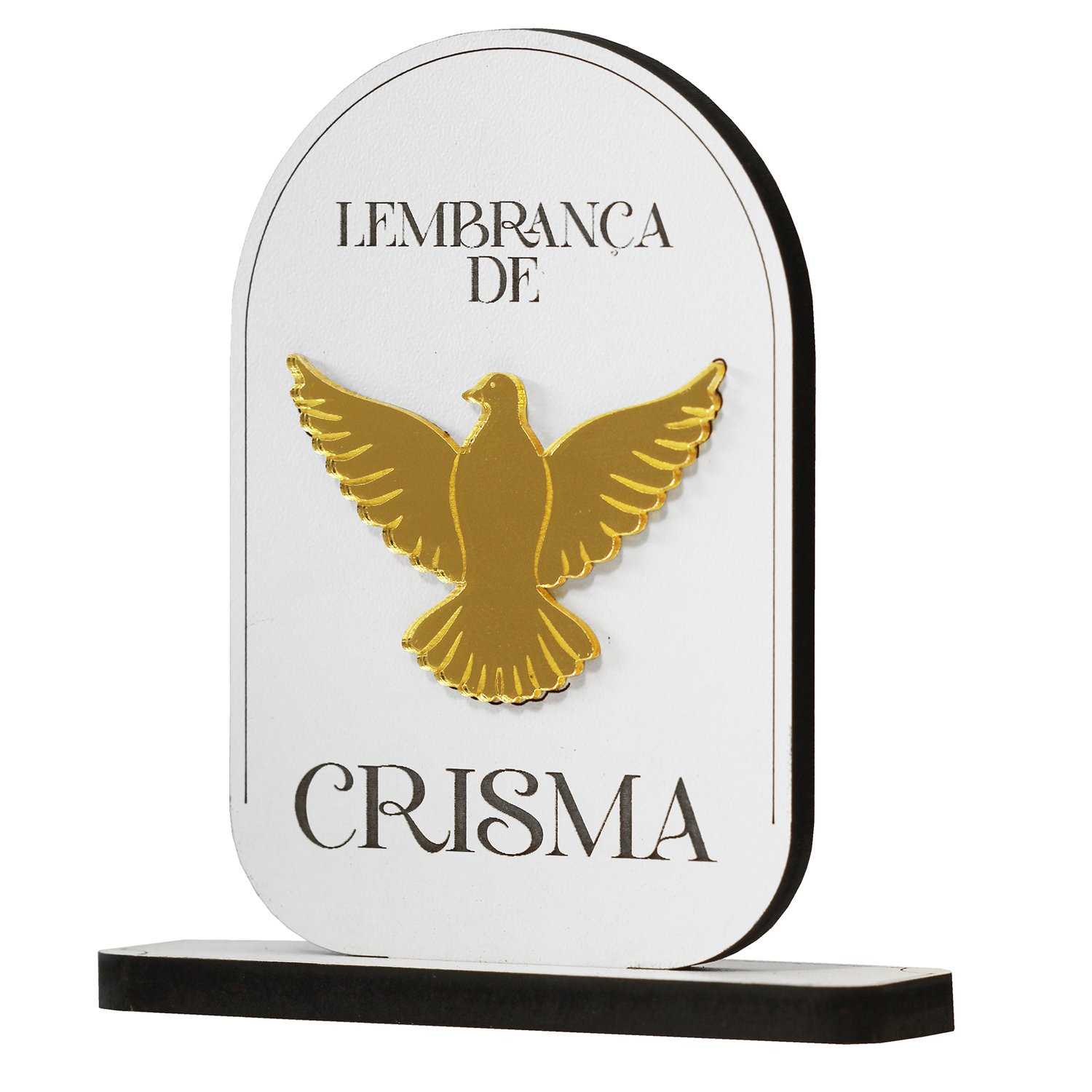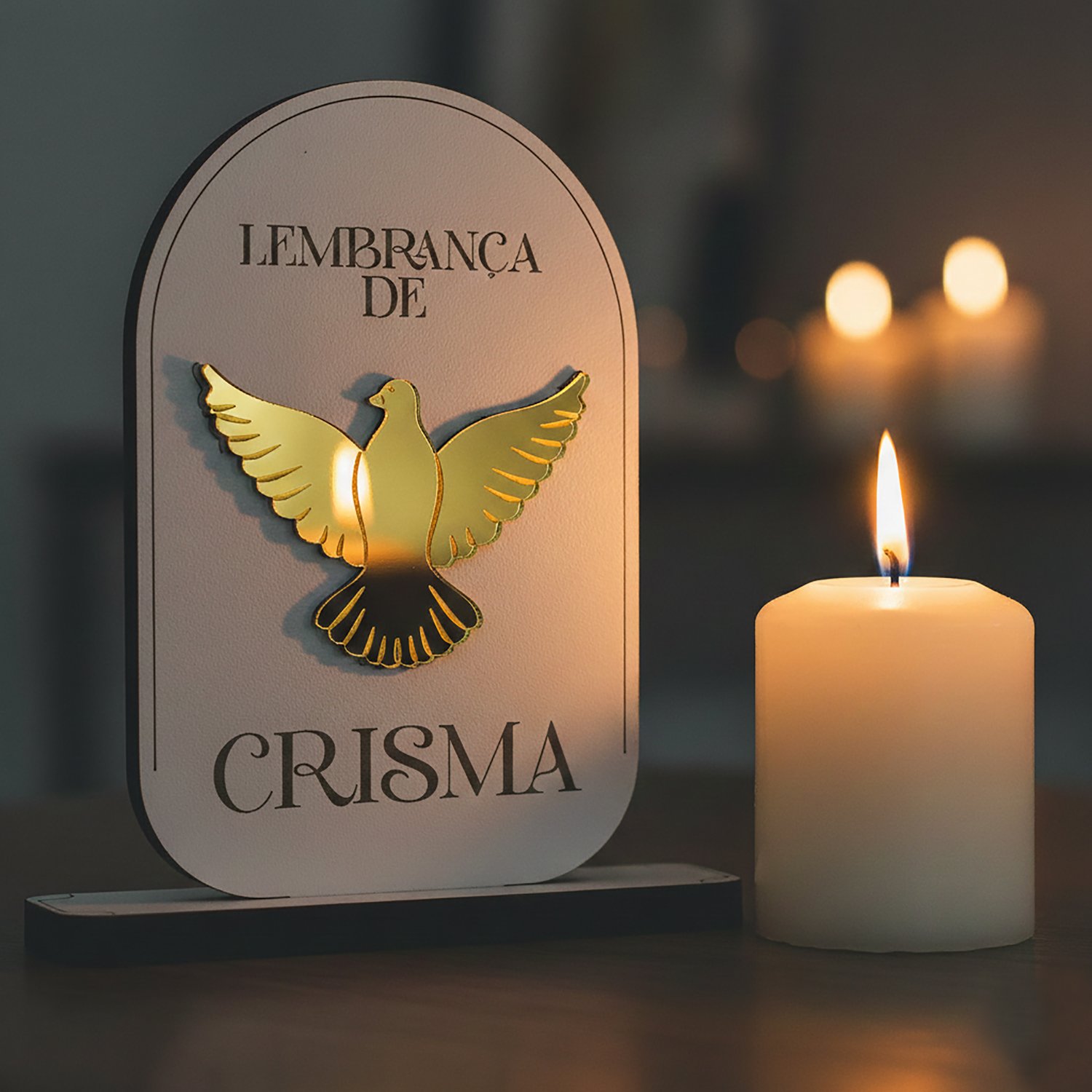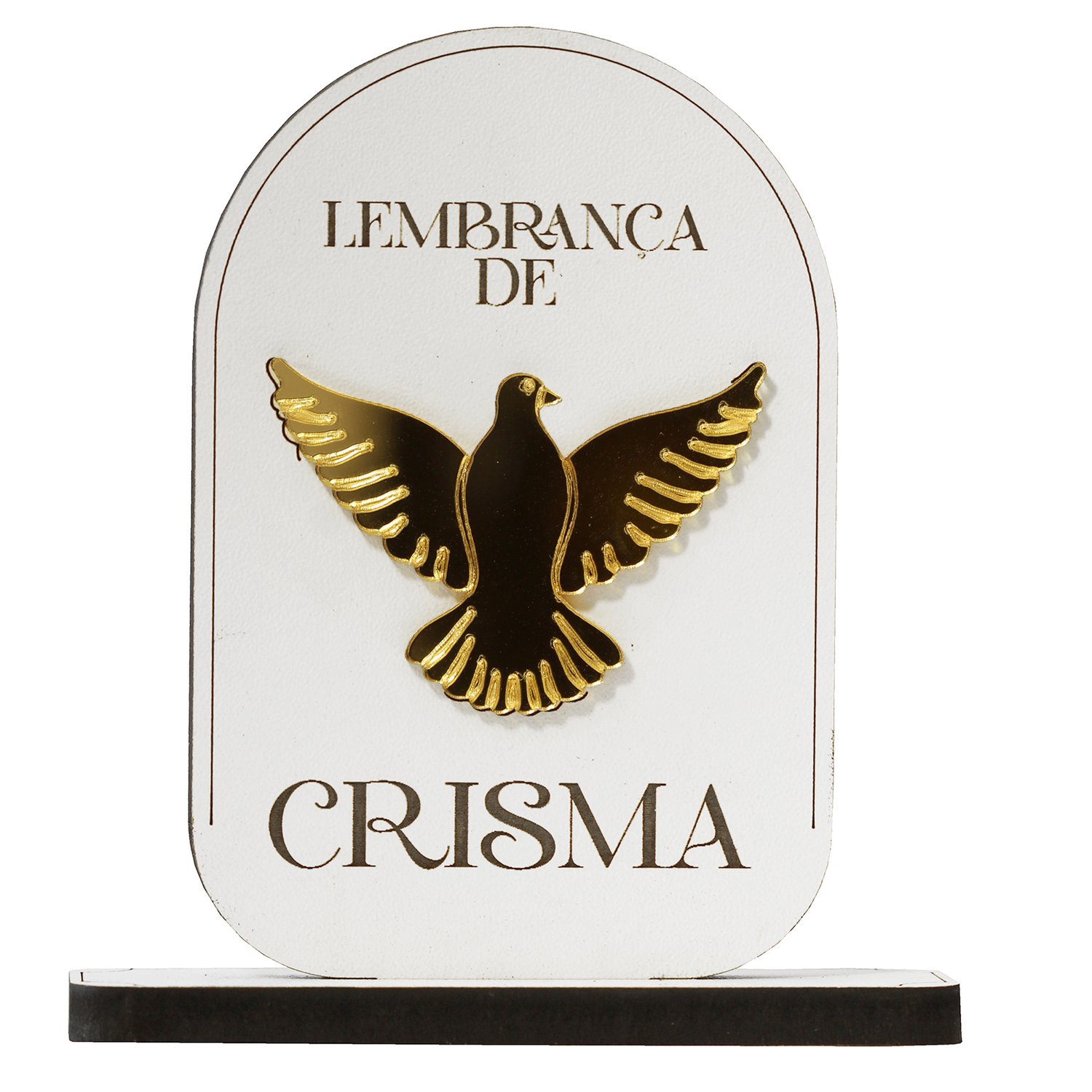 Adorno de mesa confeccionado em MDF branco 6 mm com detalhes em acrílico dourado, ambos gravados a laser com inscrições delicadas que destacam o significado de cada sacramento.