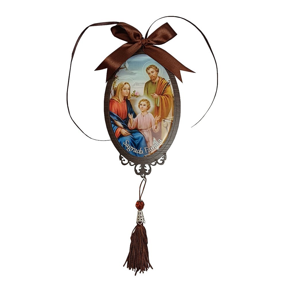 Adorno de porta oval fabricado em MDF com bordas arabescas, revestido com adesivo resinado e acabamento com laço de fita, pedras e pompom.