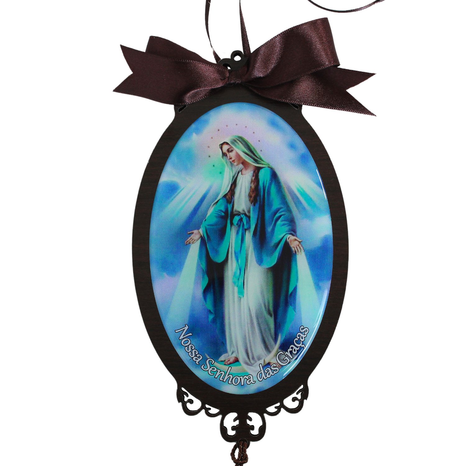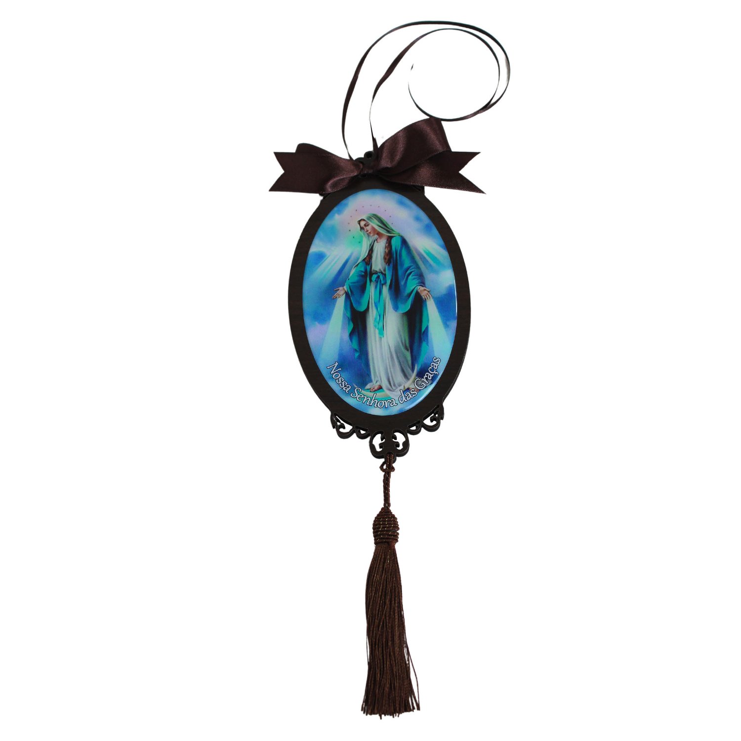 Adorno de porta oval fabricado em MDF com bordas arabescas, revestido com adesivo resinado e acabamento com laço de fita, pedras e pompom.