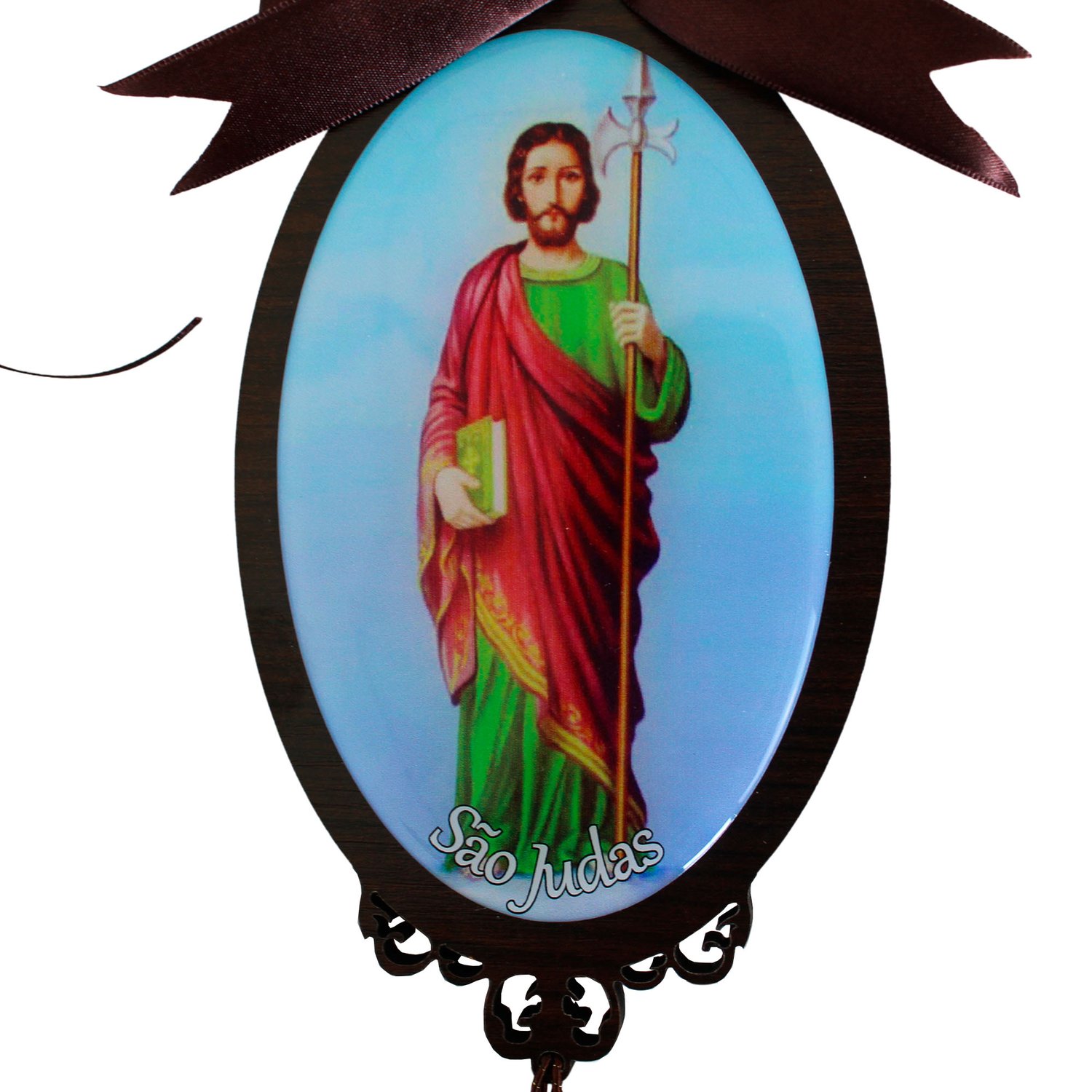 Adorno de porta oval fabricado em MDF com bordas arabescas, revestido com adesivo resinado e acabamento com laço de fita, pedras e pompom.