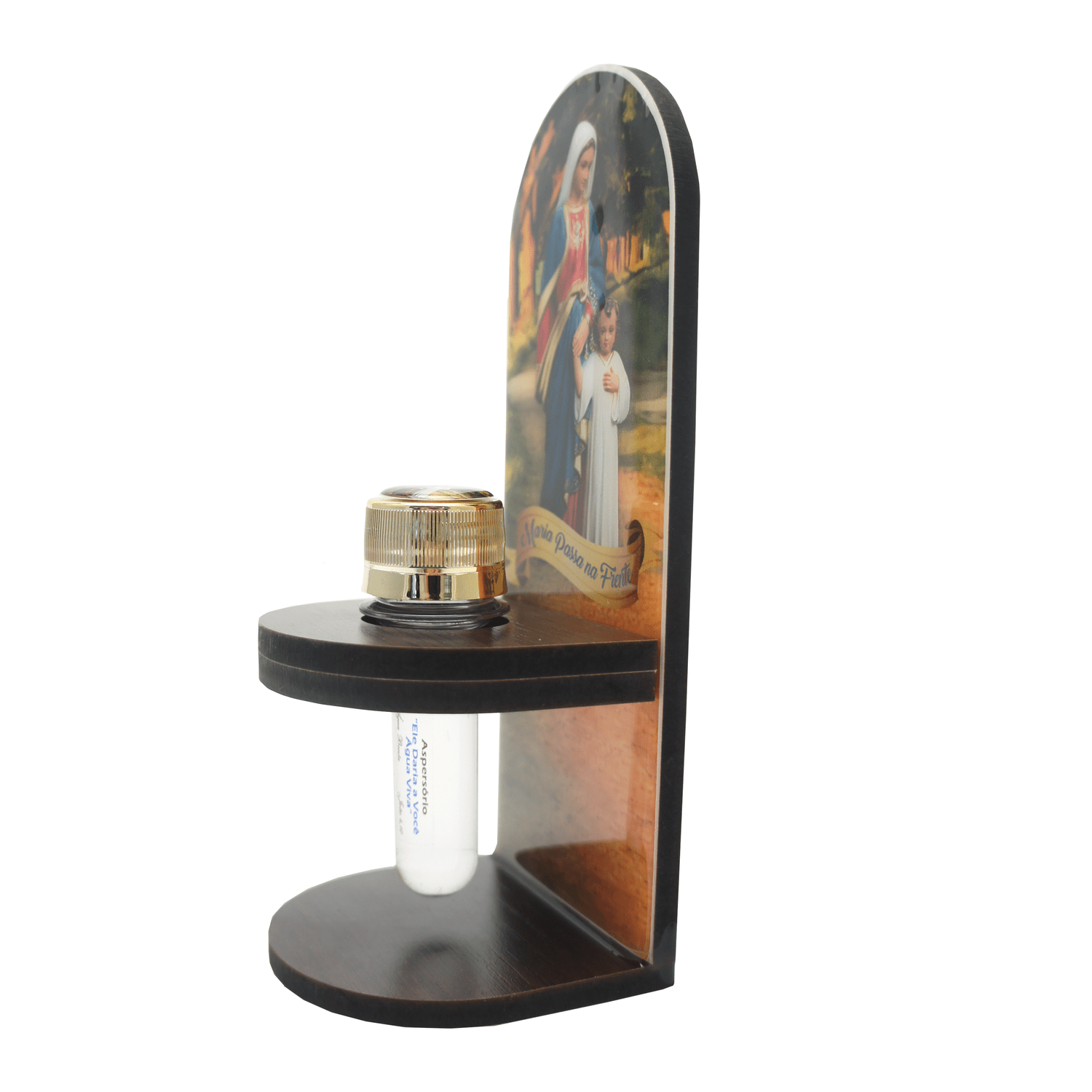 Adorno para porta ou mesa com aspersório para água benta de Maria Passa na Frente, produzido em MDF, com cobertura de resina, aspersório de material acrílico transparente com tampa dourada e adesivo do Santo. Fabricação própria.
