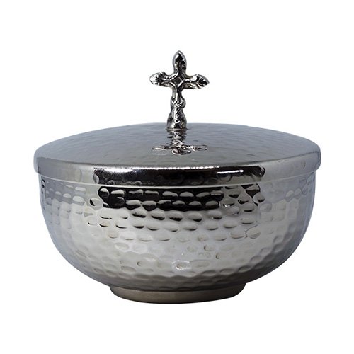 Âmbula de metal prateada em formato de cuia com tampa, ideal para distribuição.