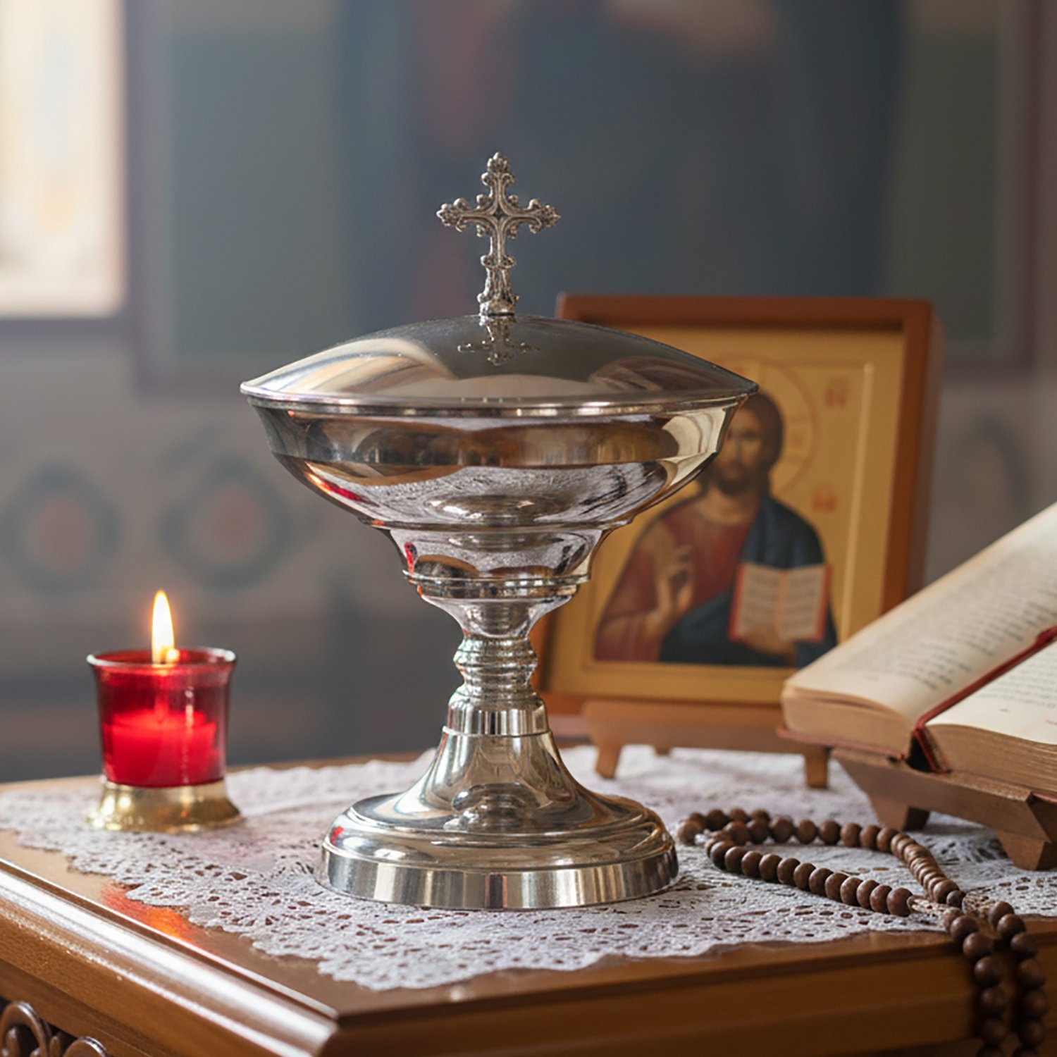 Âmbula ou cibório. É semelhante ao cálice mas contém uma tampa. Nela colocam-se as hóstias para a distribuição e após a Missa são guardadas no sacrário. Podem ter diversas formas. São geralmente pratas ou douradas, e geralmente de material oxidável e dentro dourada. Usadas nas celebrações para colocar as partículas (hóstias), e levadas ao altar no momento do ofertório.