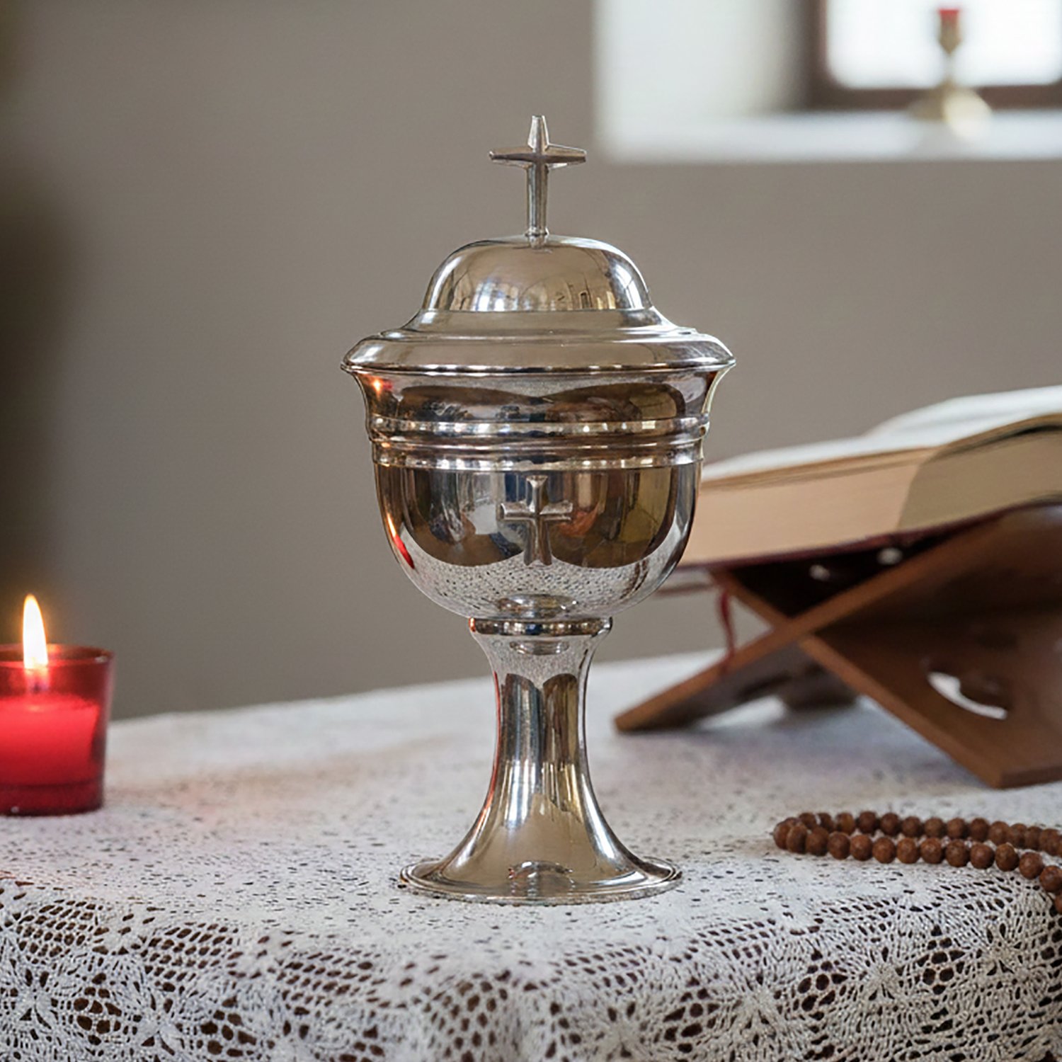 Âmbula ou cibório. É semelhante ao cálice mas contém uma tampa. Nela colocam-se as hóstias para a distribuição e após a Missa são guardadas no sacrário. Podem ter diversas formas. São geralmente pratas ou douradas, e geralmente de material oxidável e dentro dourada. Usadas nas celebrações para colocar as partículas (hóstias), e levadas ao altar no momento do ofertório.