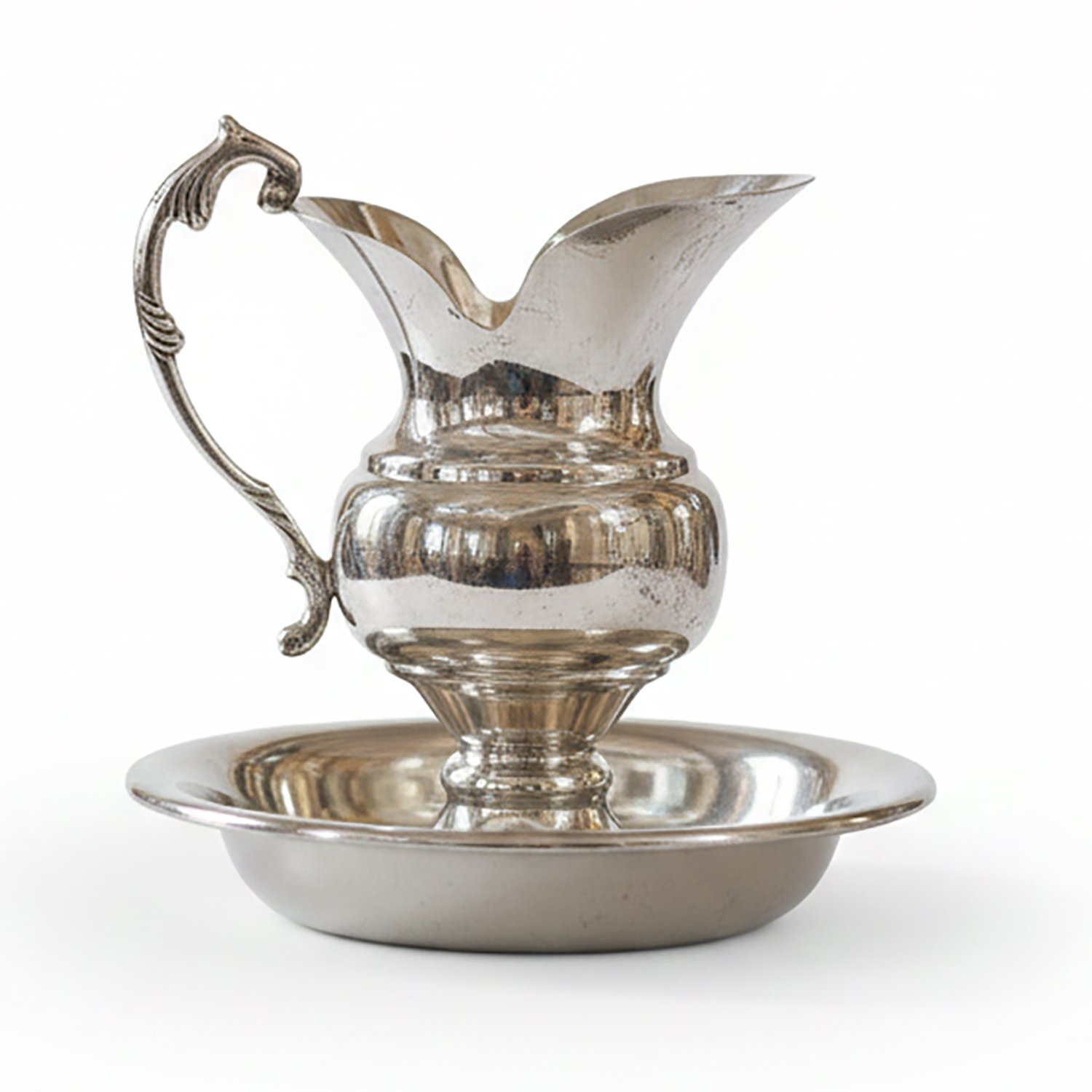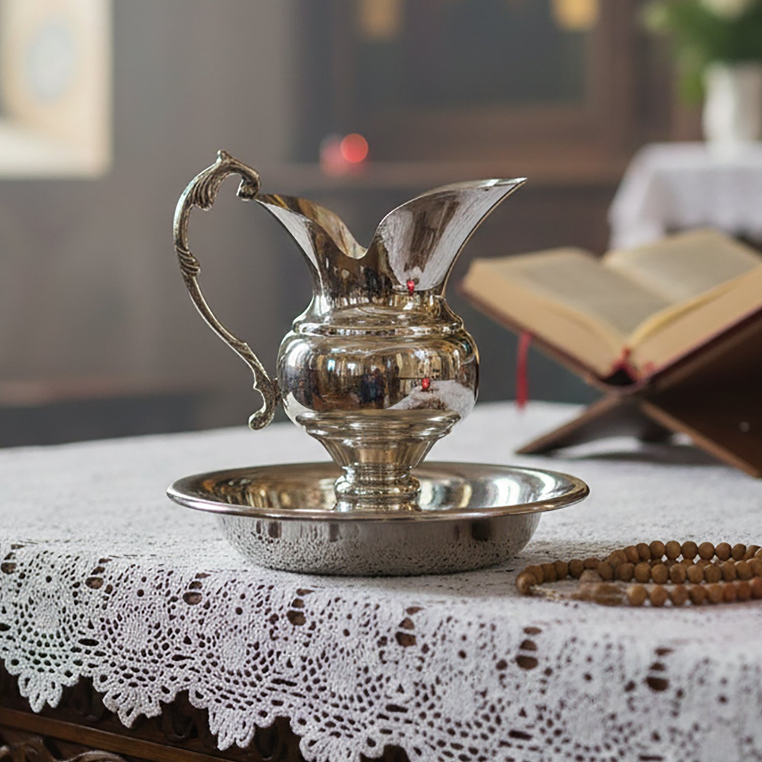 Ânfora e bacia litúrgicas são utilizadas pelo sacerdote no rito de purificação das mãos antes da preparação do sagrado, especialmente durante a celebração. Esse gesto simboliza a purificação interior, a reverência e a disposição espiritual para servir a Deus com dignidade e devoção.