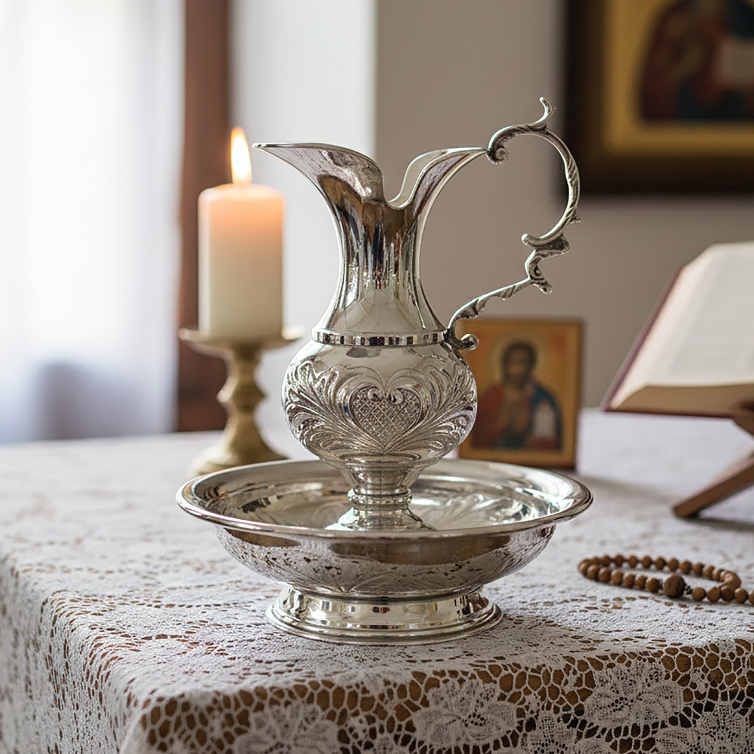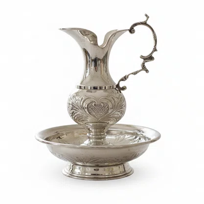 Ânfora e bacia litúrgicas são utilizadas pelo sacerdote no rito de purificação das mãos antes da preparação do sagrado, especialmente durante a celebração. Esse gesto simboliza a purificação interior, a reverência e a disposição espiritual para servir a Deus com dignidade e devoção.