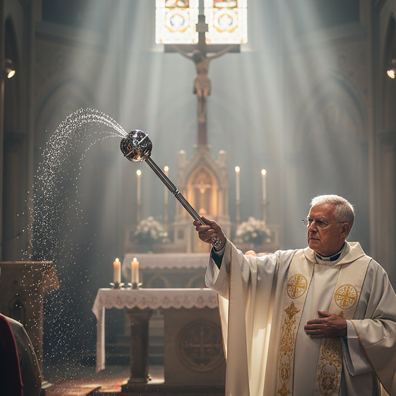 O aspersório é um instrumento usado para aspergir os fiéis com água benta e a caldeira é a vasilha onde se coloca a água benta usada para aspergir os fiéis.