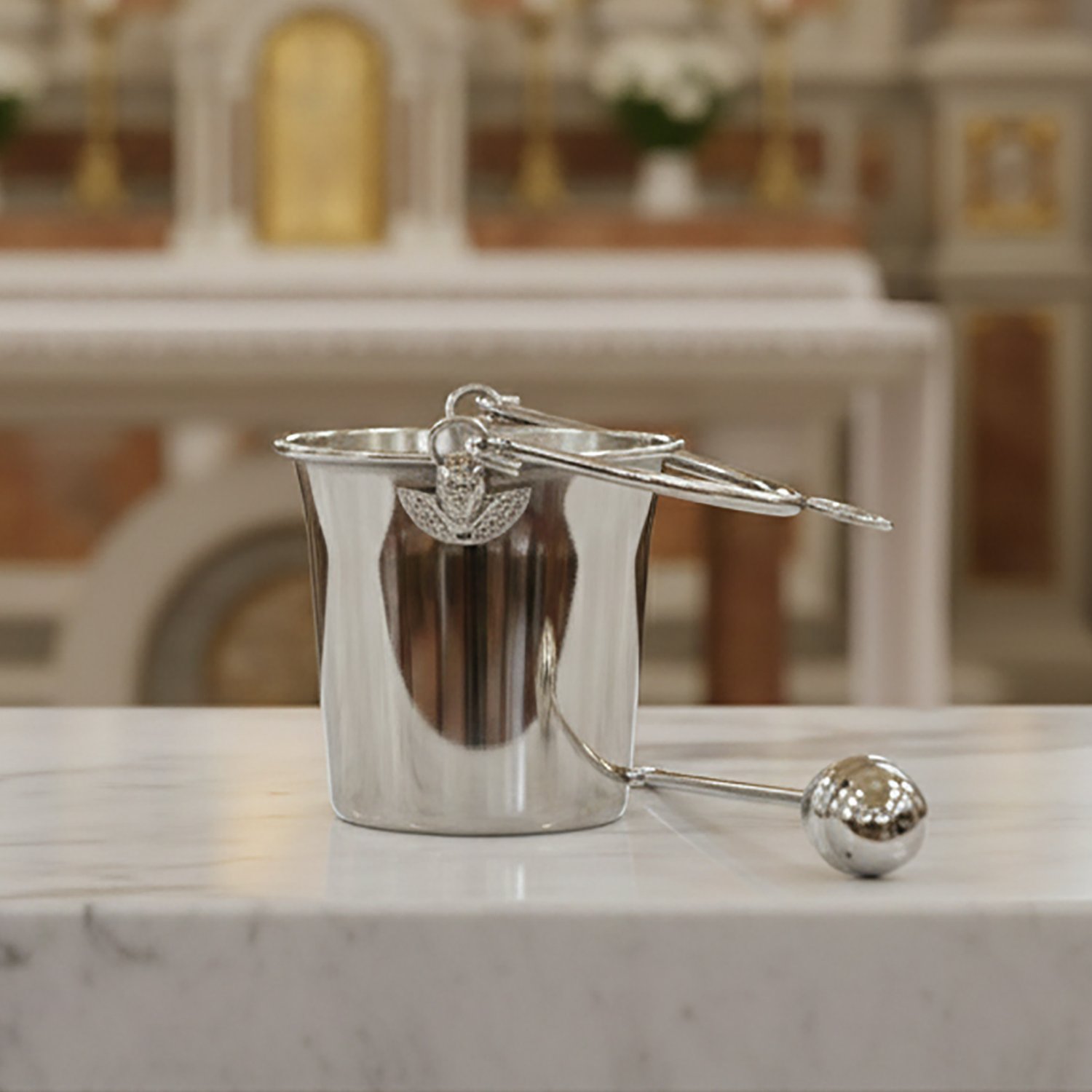 Baldinho onde se coloca água benta para aspersão das pessoas e objetos.