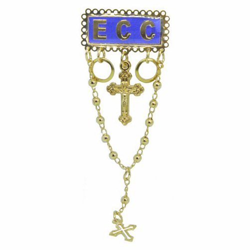 Boton com siglas ECC letra dourada no fundo azul com terço, argolas simbolizando alianças entre elas crucifixo, tudo em dourado.
