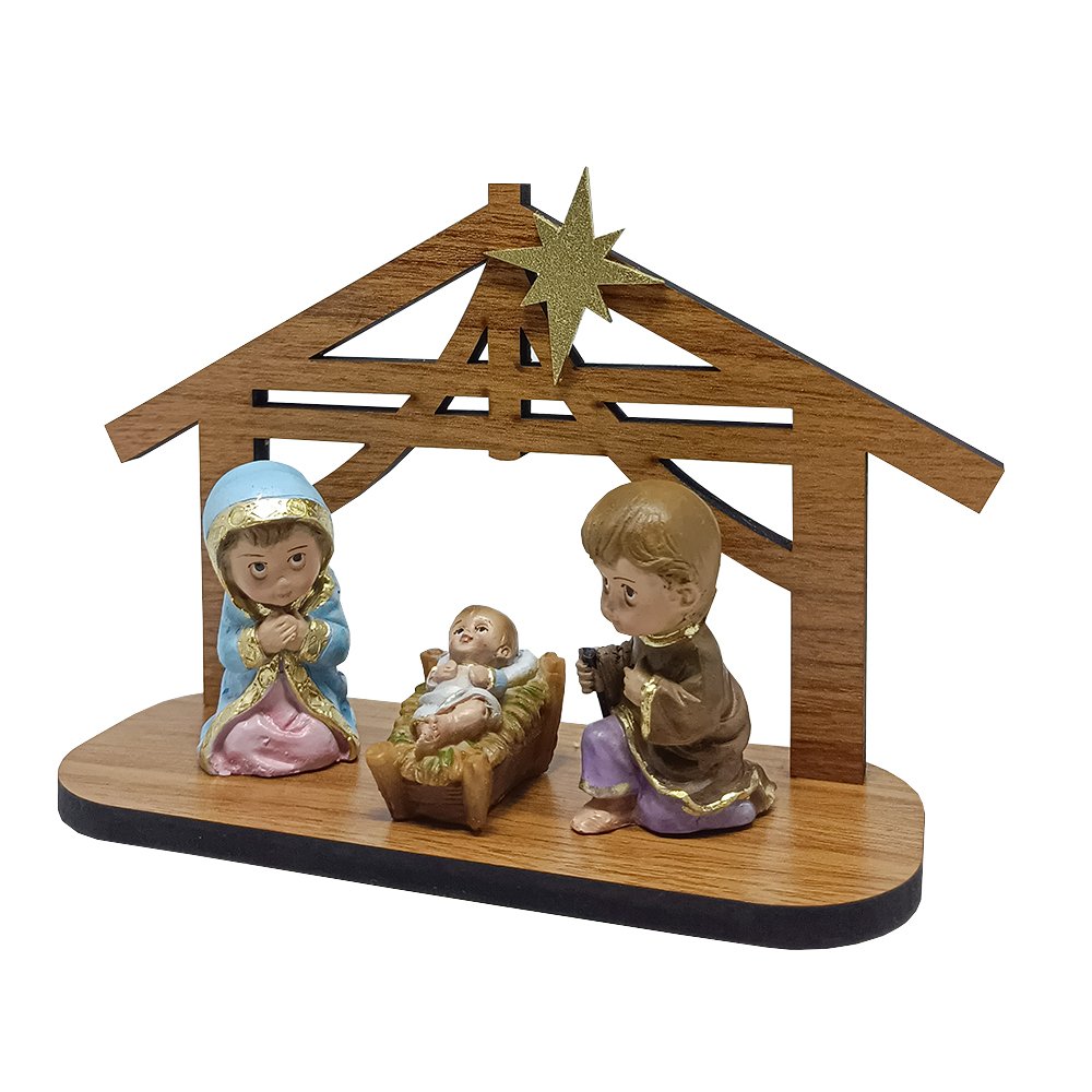 Cabana Natal MDF Revestido na cor Louro Freijó Com Sagrada Família Infantil de Resina Nacional de fabricação própria.