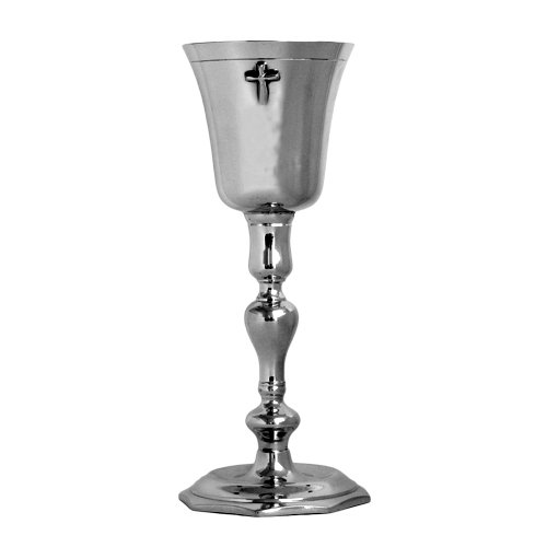 Cálice médio de estanho prateado com base talhada em detalhe octogonal.
