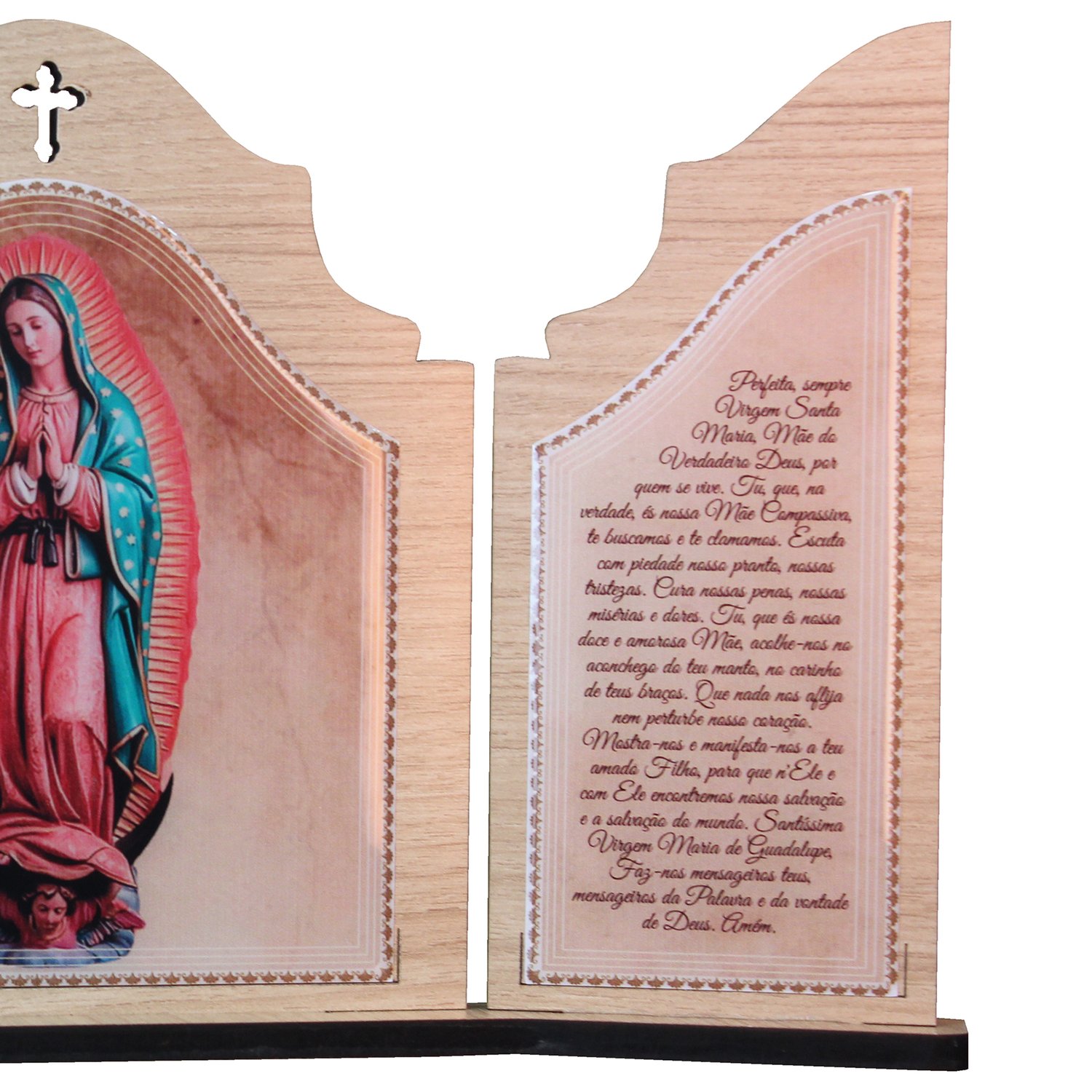 Capela com Porta Não articulada de MDF revestido com adesivo resinado e oração de Nossa Senhora Guadalupe.
