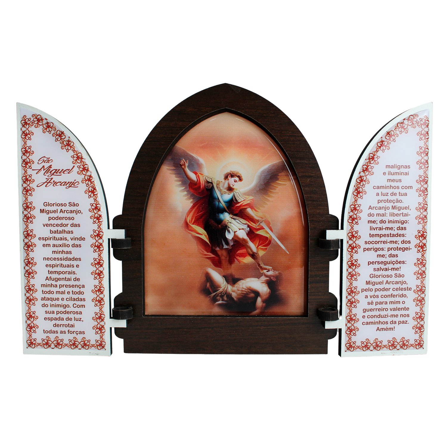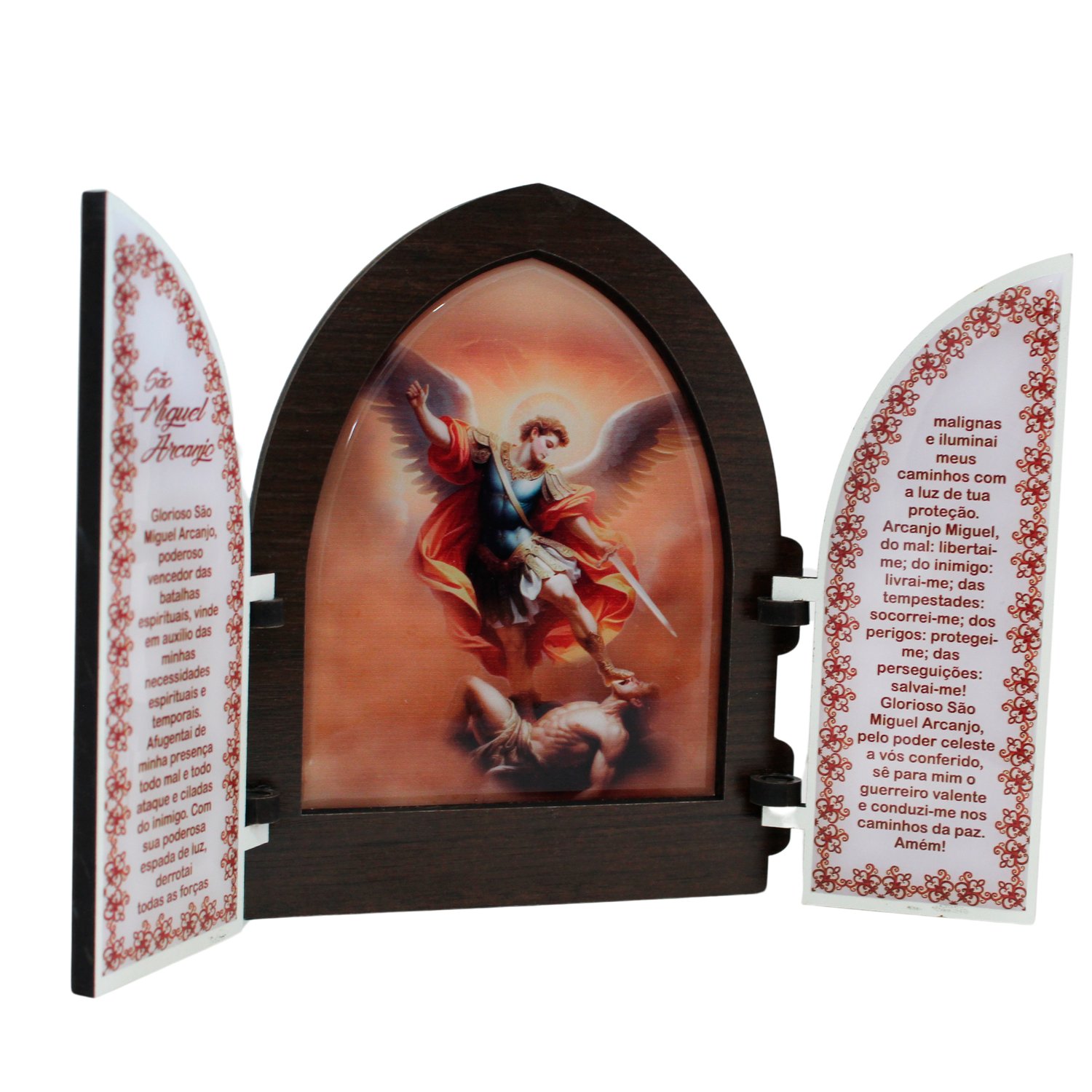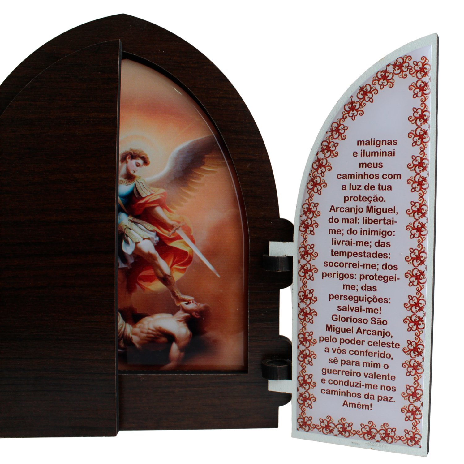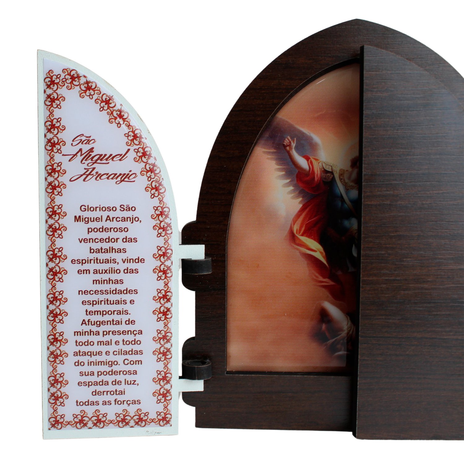 Capela produzida em Mdf revestido 6 mm - Sistema com porta que pode ser aberta e fechada - Imagem de Arcanjo São Miguel e oração resinadas. FABRICAÇÃO PRÓPRIA