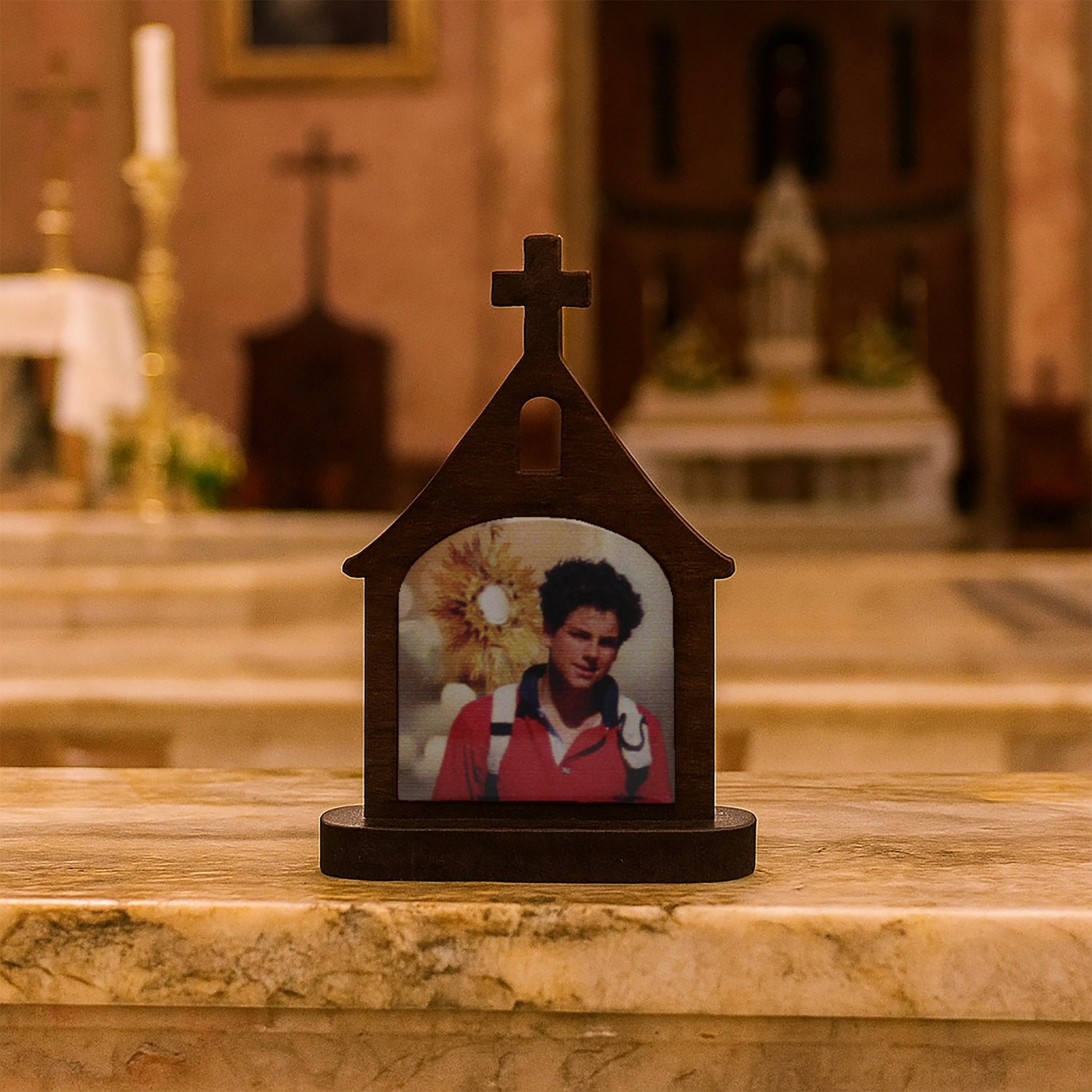 Capelinha de mesa com adesivo resinado de São Carlo Acutis