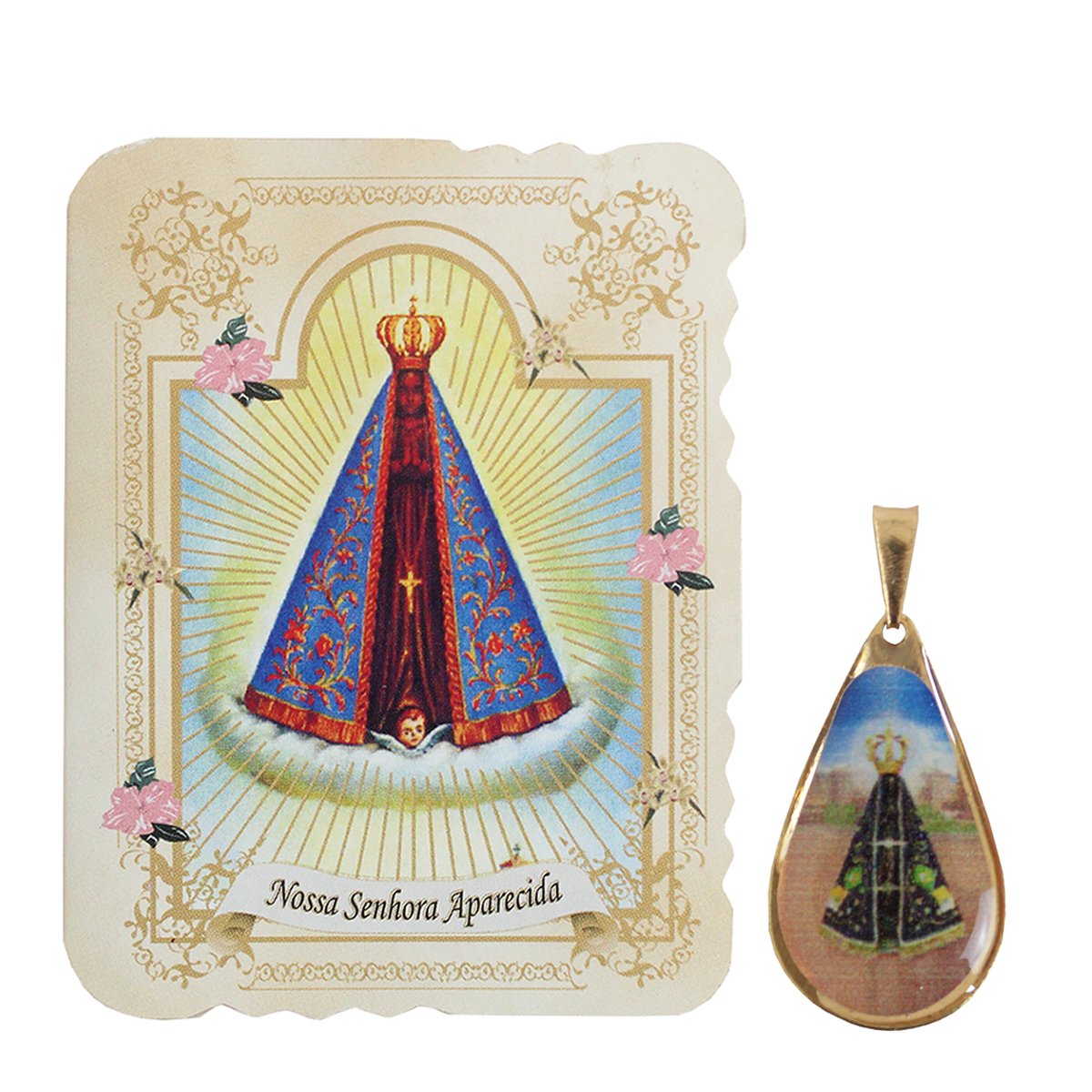 Cartão para lembrança de Nossa Senhora Aparecida, acompanha medalha. Fechamento com velcro.