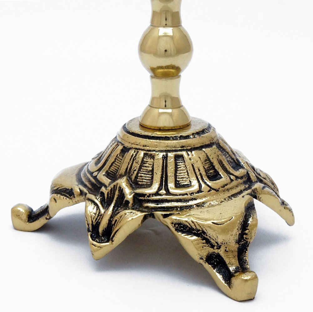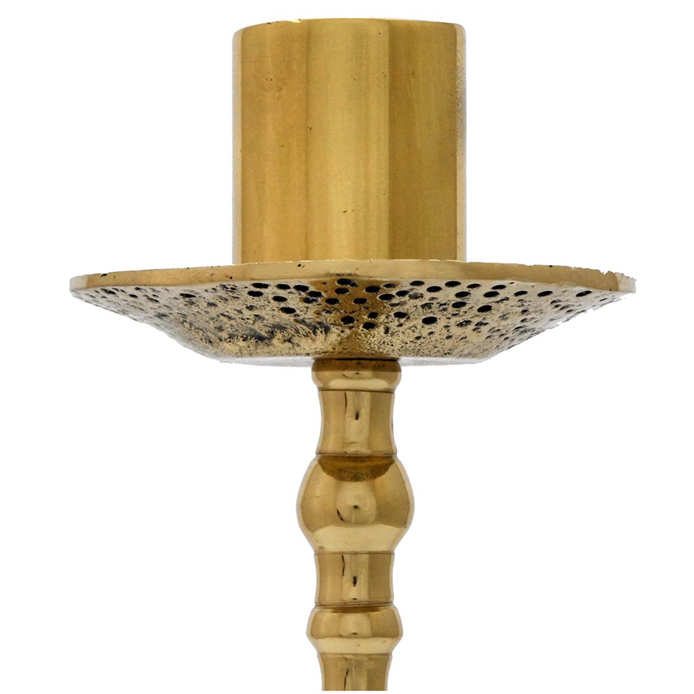 Castiçal para 1 vela, confeccionado em bronze maciço, trabalhado à mão e com riqueza nos detalhes. Se o castiçal for pequeno e discreto, poderá ser colocado sobre o altar, normalmente são dois. Castiçais maiores devem ficar ao lado da mesa do altar.