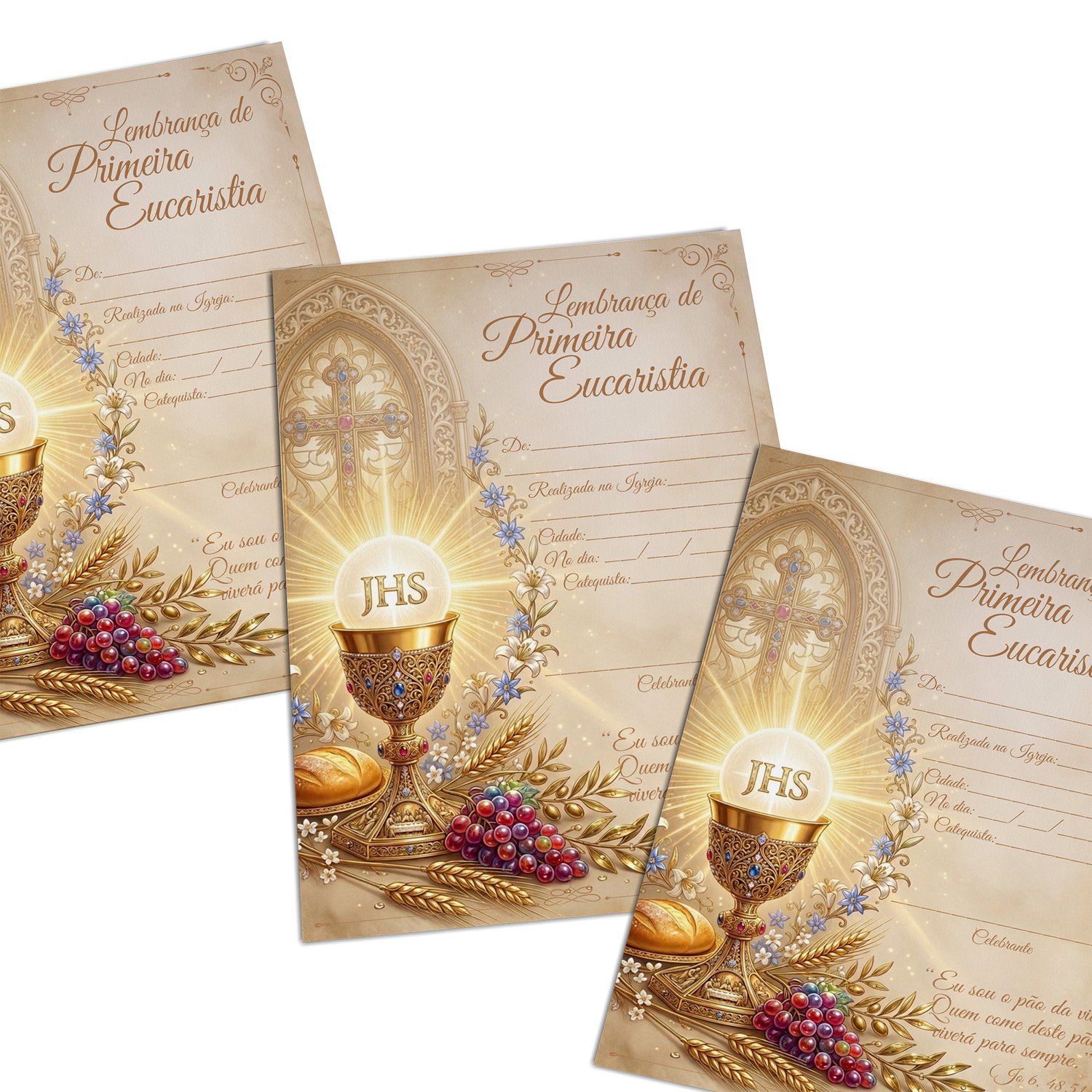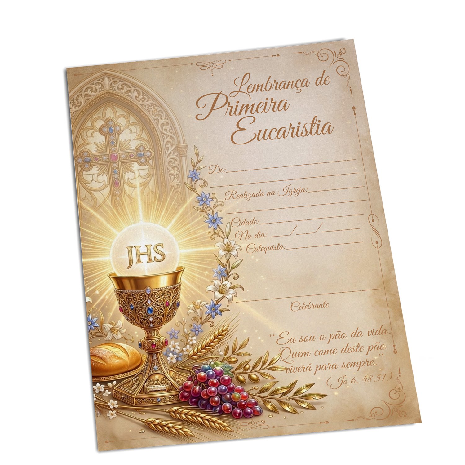O certificado de Primeira Eucaristia é fornecida após a realização da cerimônia como uma lembrança. Impresso em papel couchê brilho 250 gr proporciona melhor acabamento e oferece melhores resultados tanto na qualidade quanto na durabilidade dos impressos. Formato pré-preenchido.