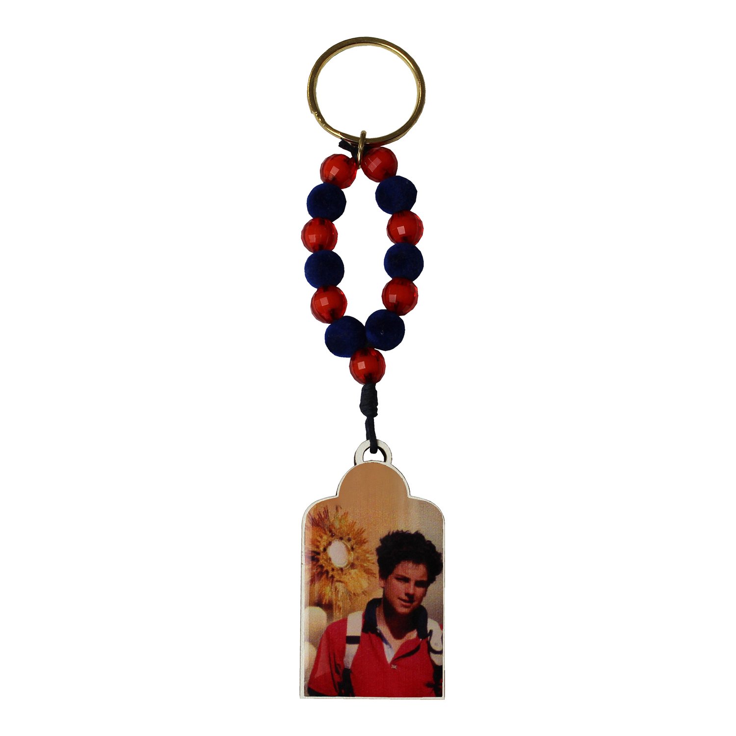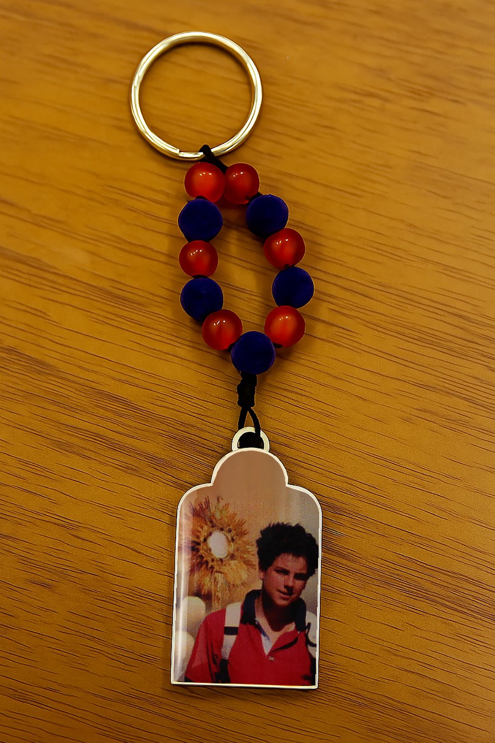 Chaveiro Madeira de São Carlo Acutis adesivo resinado.