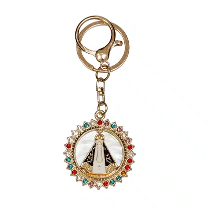 Chaveiro Nossa Senhora Aparecida Redondo Dourado Strass Colorido
