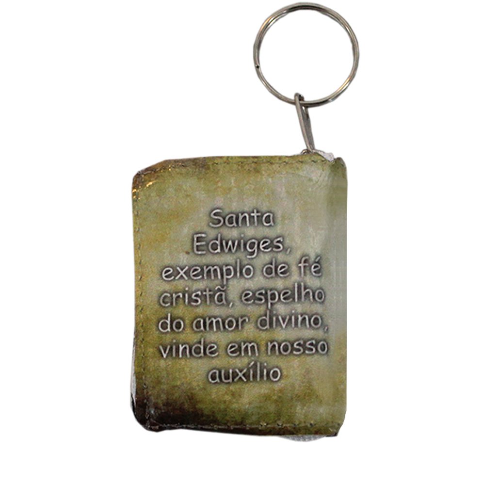 Chaveiro de plástico com acabamento em corino impresso com zíper e argola.