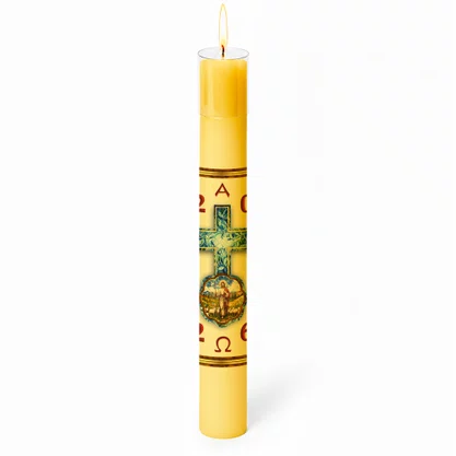 Círio Pascal tradicional, produzido em parafina nas cores amarela ou branca, disponível em diversos tamanhos.