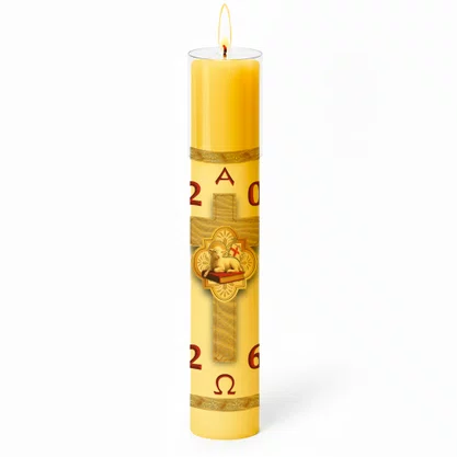 Círio Pascal tradicional, produzido em parafina nas cores amarela ou branca, disponível em diversos tamanhos.