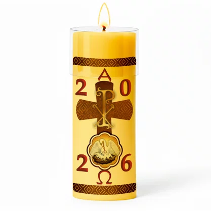Círio Pascal tradicional, produzido em parafina nas cores amarela ou branca, disponível em diversos tamanhos.