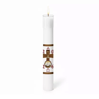 Círio Pascal tradicional, produzido em parafina nas cores amarela ou branca, disponível em diversos tamanhos.