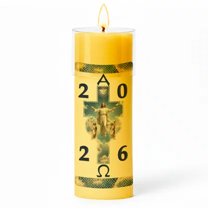 Círio Pascal tradicional, produzido em parafina nas cores amarela ou branca, disponível em diversos tamanhos.