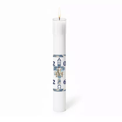 Círio Pascal tradicional, produzido em parafina nas cores amarela ou branca, disponível em diversos tamanhos.