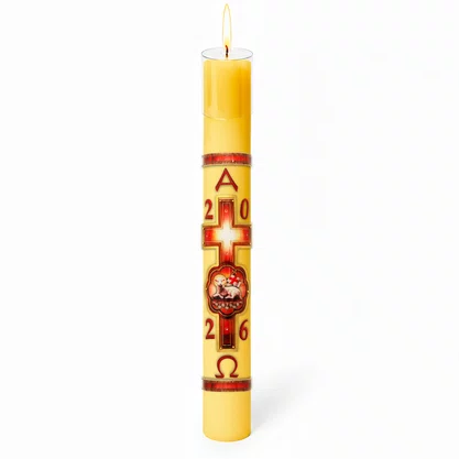 Círio Pascal tradicional, produzido em parafina nas cores amarela ou branca, disponível em diversos tamanhos.