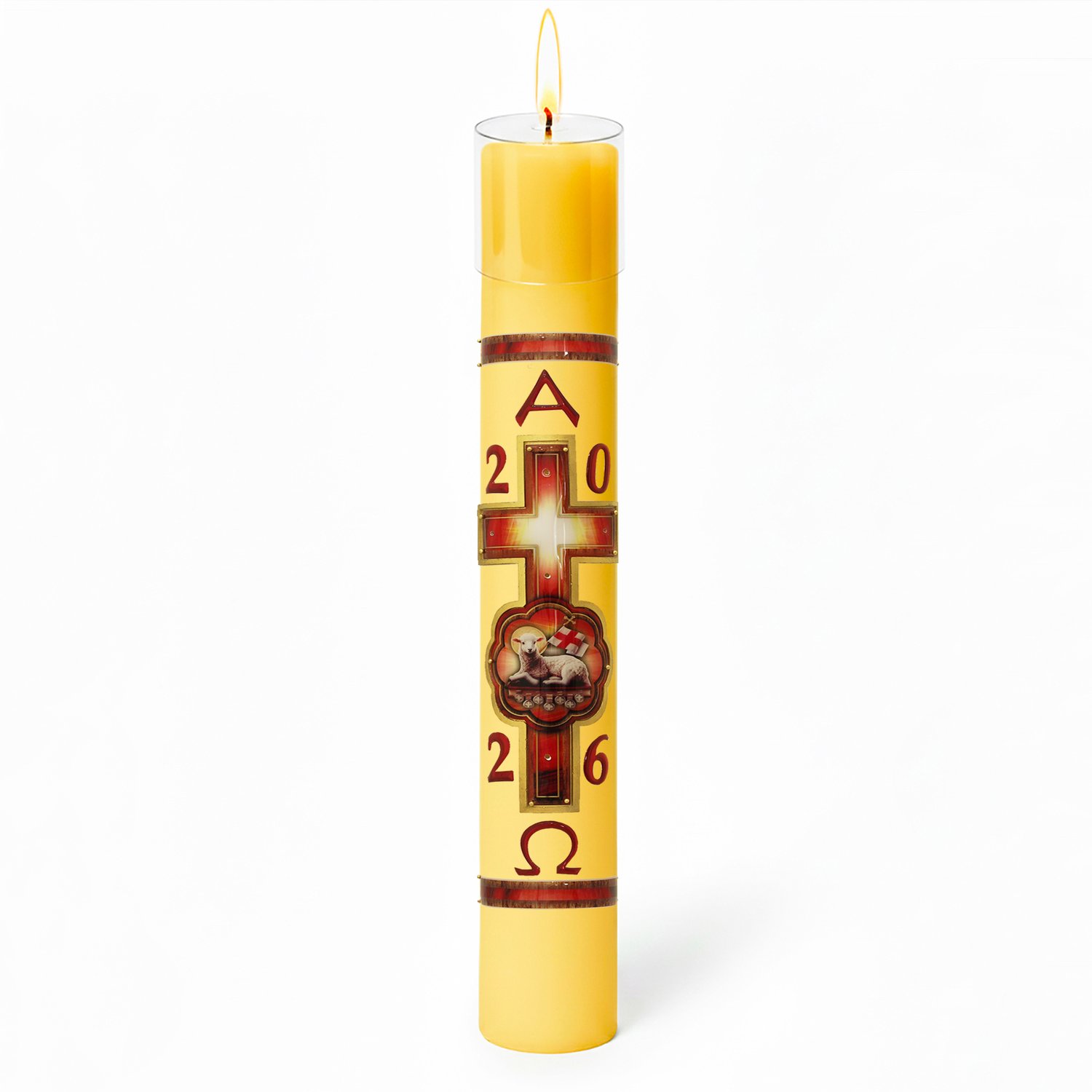 Círio Pascal tradicional, produzido em parafina nas cores amarela ou branca, disponível em diversos tamanhos.