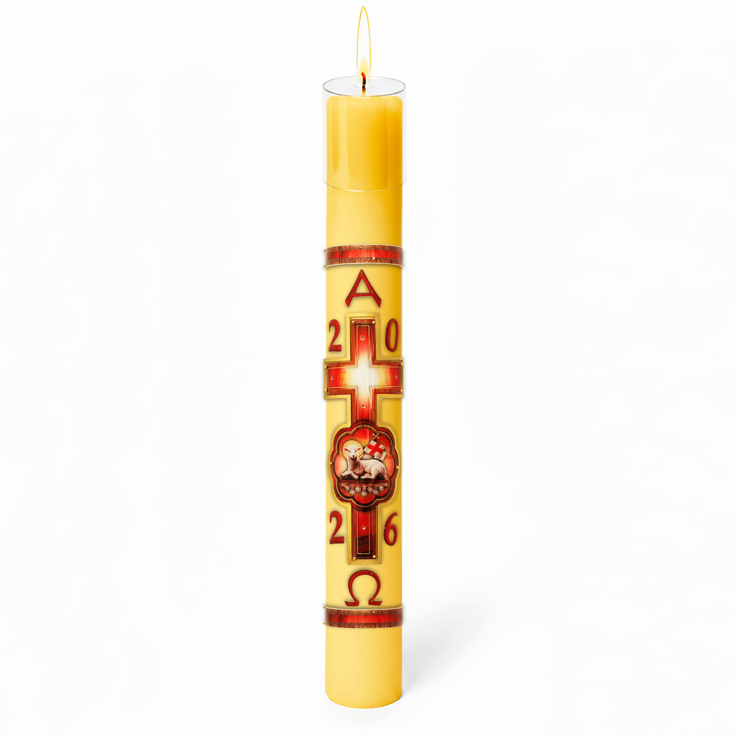 Círio Pascal tradicional, produzido em parafina nas cores amarela ou branca, disponível em diversos tamanhos.