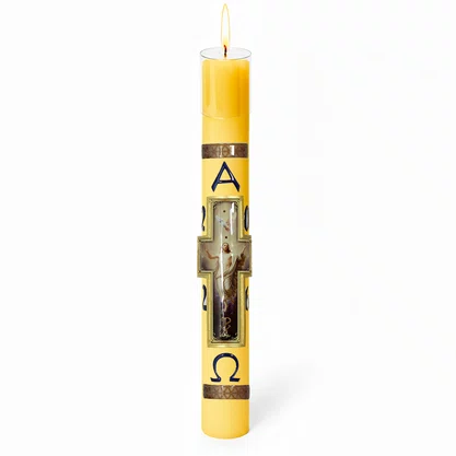 Círio Pascal tradicional, produzido em parafina nas cores amarela ou branca, disponível em diversos tamanhos.