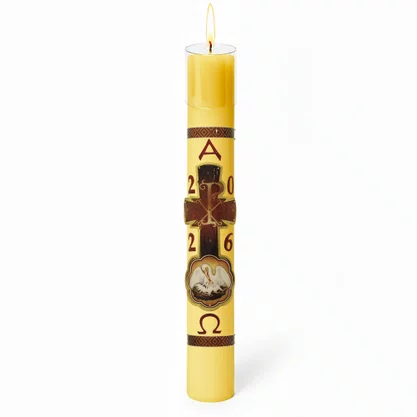 Círio Pascal tradicional, produzido em parafina nas cores amarela ou branca, disponível em diversos tamanhos.