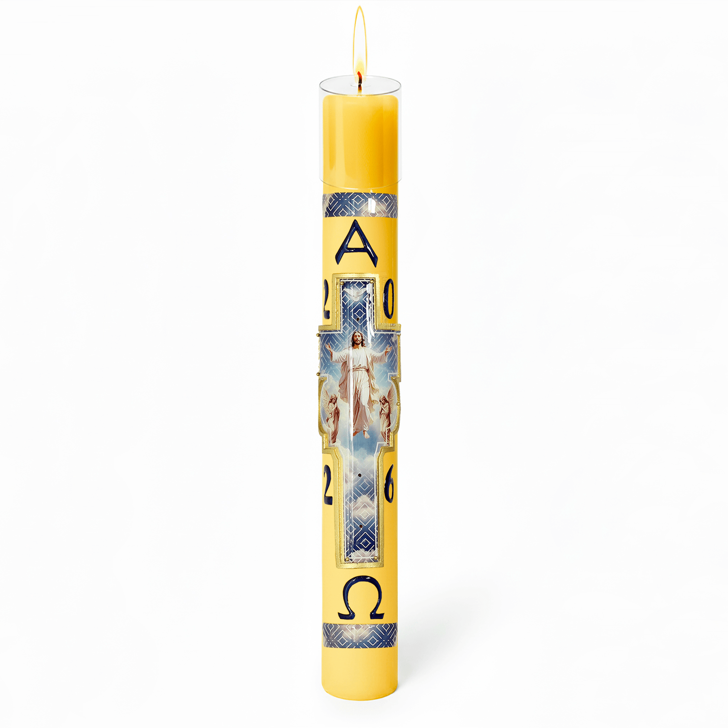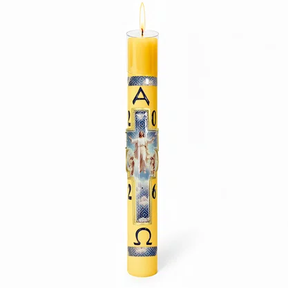 Círio Pascal tradicional, produzido em parafina nas cores amarela ou branca, disponível em diversos tamanhos.