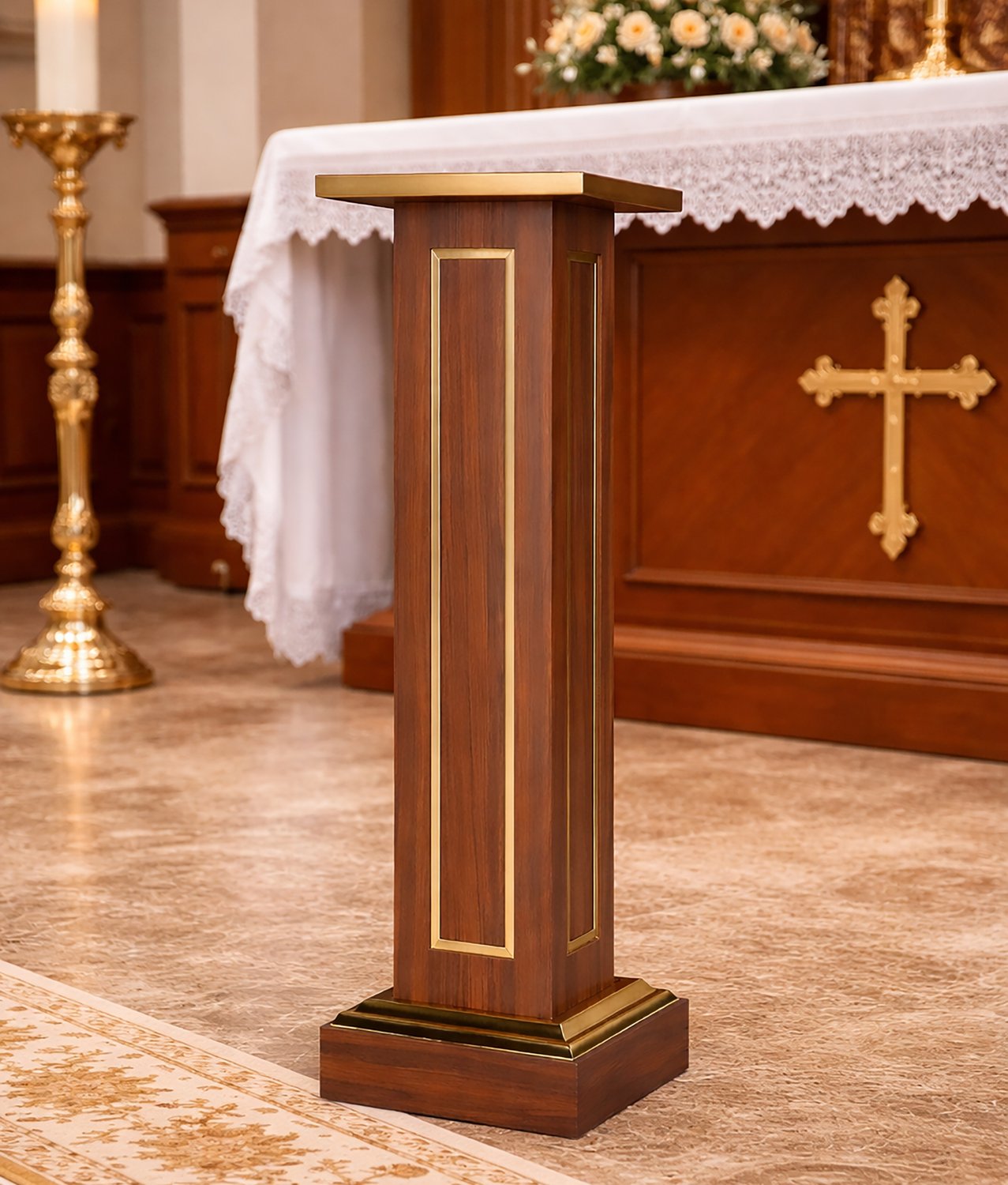 Coluna Pedestal em Madeira Escura para Imagens Detalhe Dourado