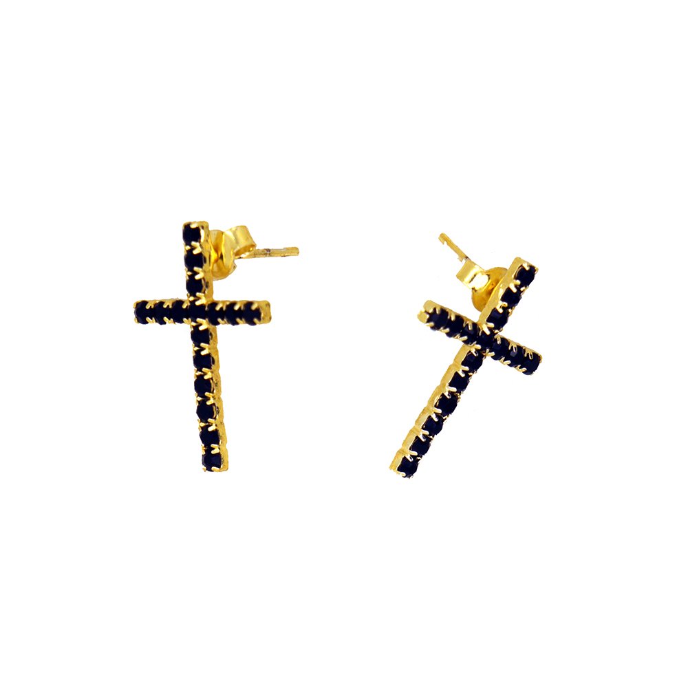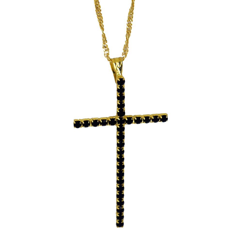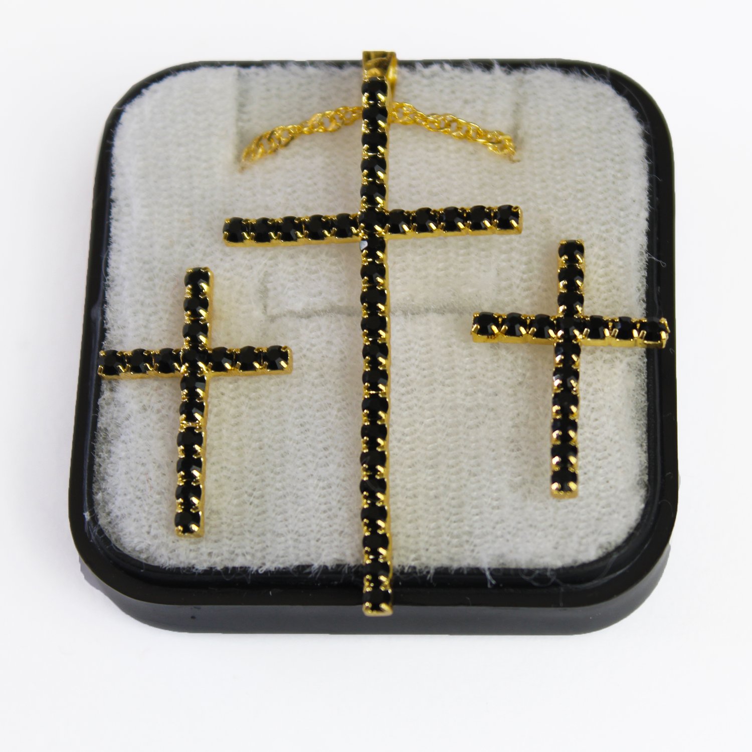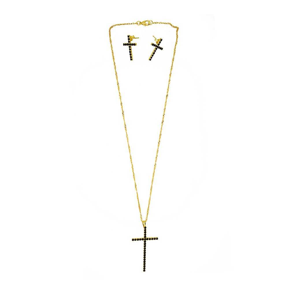 Conjunto Brinco e Pingente Cruz Strass Fina Preto