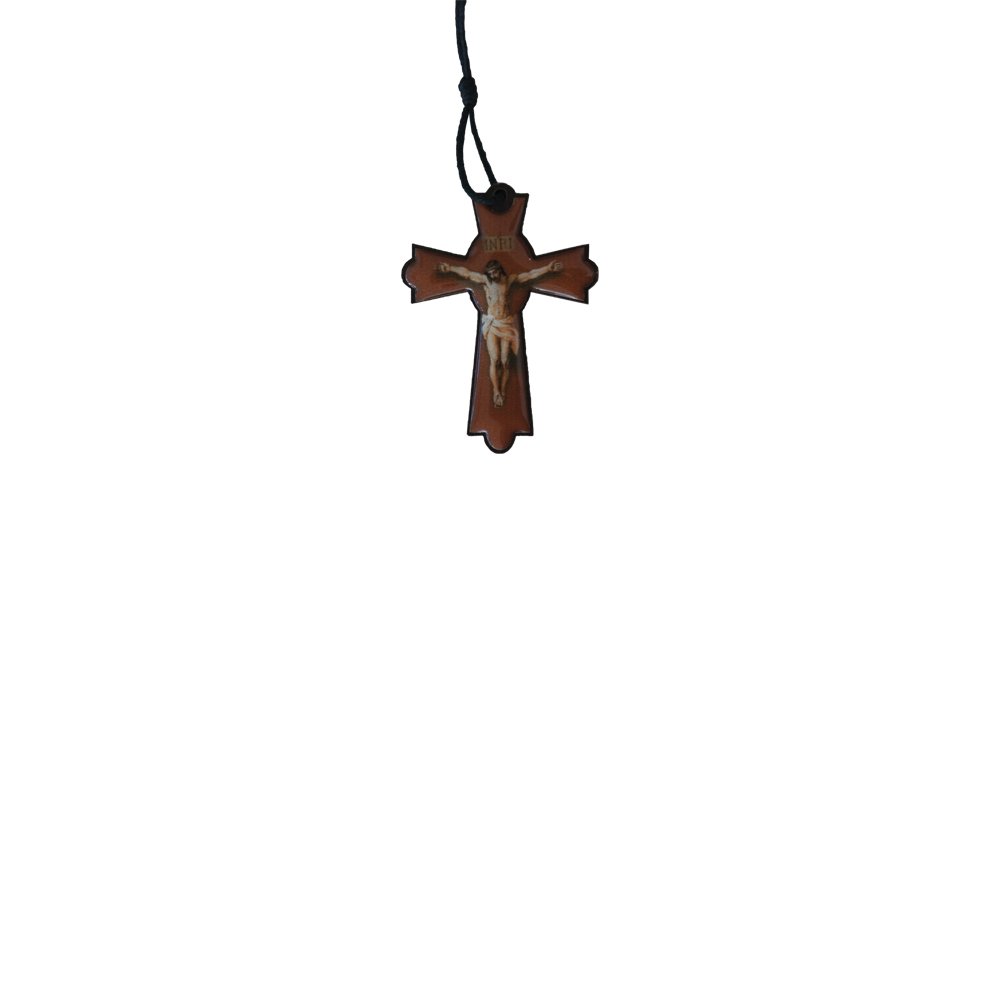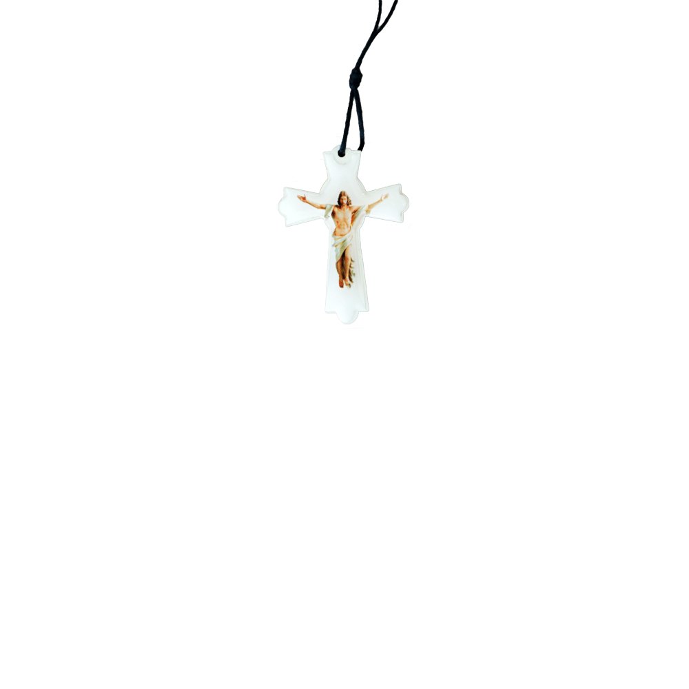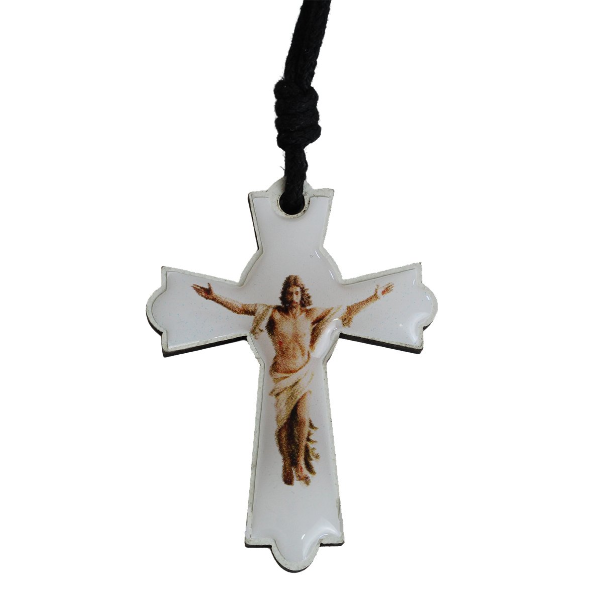 Cordão com crucifixo em MDF revestido com imagem de Cristo Crucificado de um lado e Cristo Ressuscitado do outro lado. Cordão na cor preta com fecho facilitando a colocação e servindo em qualquer pessoa. Resistente e durável. Fabricação própria.