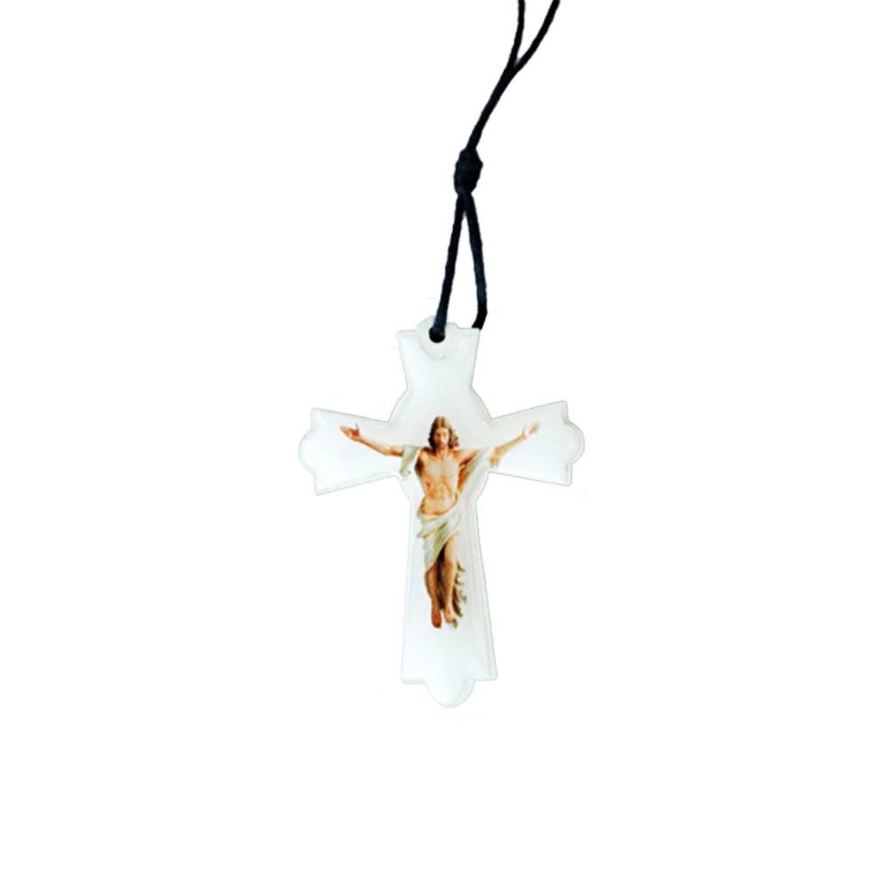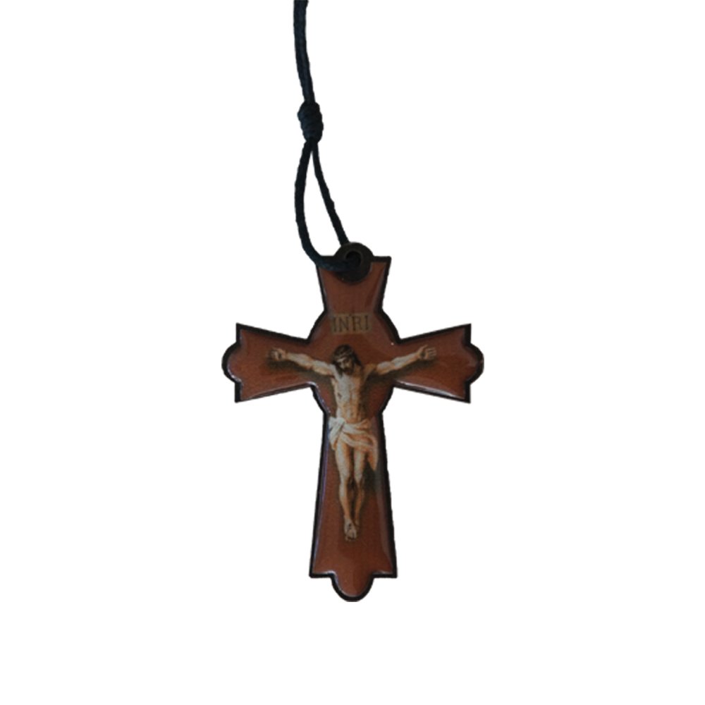 Cordão com crucifixo em MDF revestido com imagem de Cristo Crucificado de um lado e Cristo Ressuscitado do outro lado. Cordão na cor preta com fecho facilitando a colocação e servindo em qualquer pessoa. Resistente e durável. Fabricação própria.