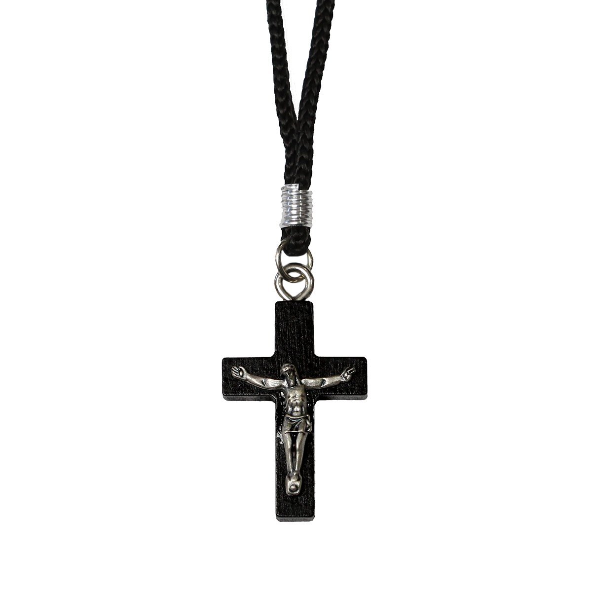 Cordão com Crucifixo em Madeira Preta com Aplique Cristo Prateado.